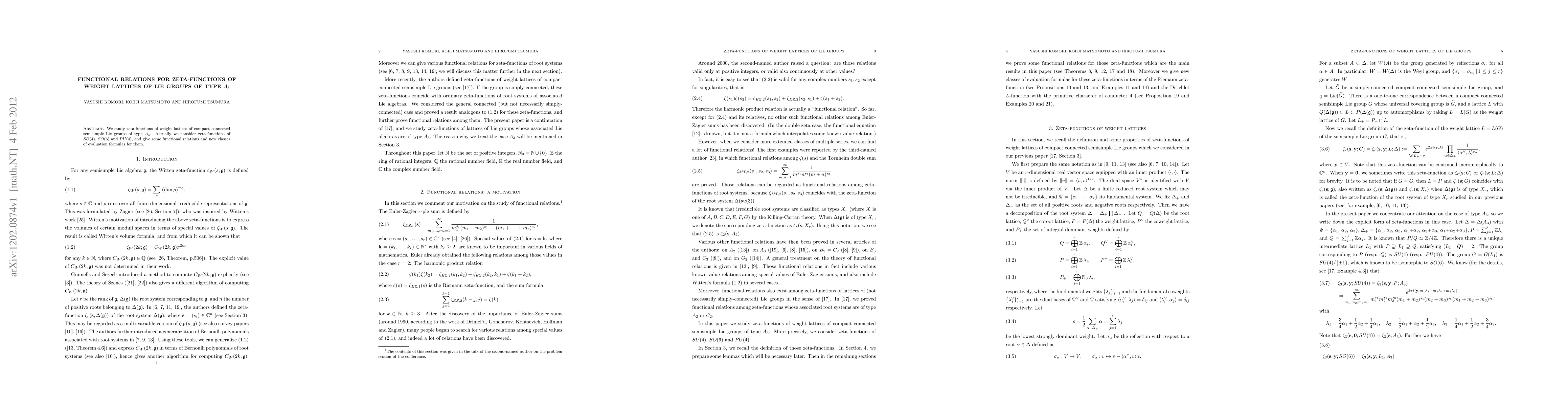 This paper explores zeta-functions associated with the weight lattices of compact connected semisimple Lie groups of type $A_3$, specifically focusing on SU(4), SO(6), and PU(4). It presents functional relations and introduces new evaluation formulas for these zeta-functions.