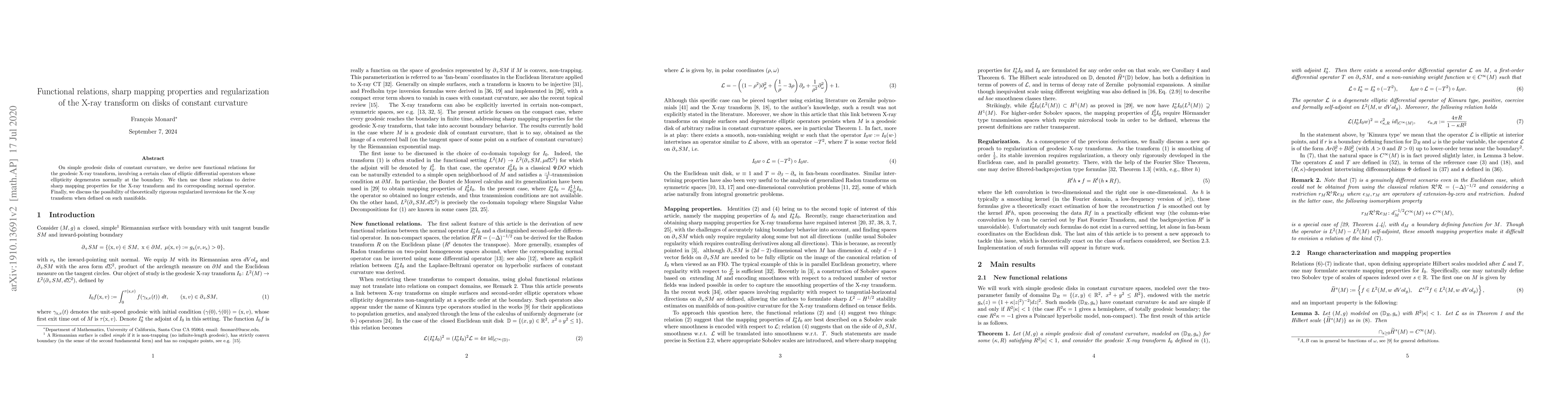 This paper derives new functional relations for the X-ray transform on geodesic disks of constant curvature, employs these to establish sharp mapping properties, and explores the potential for rigorous regularization of the transform on such manifolds.