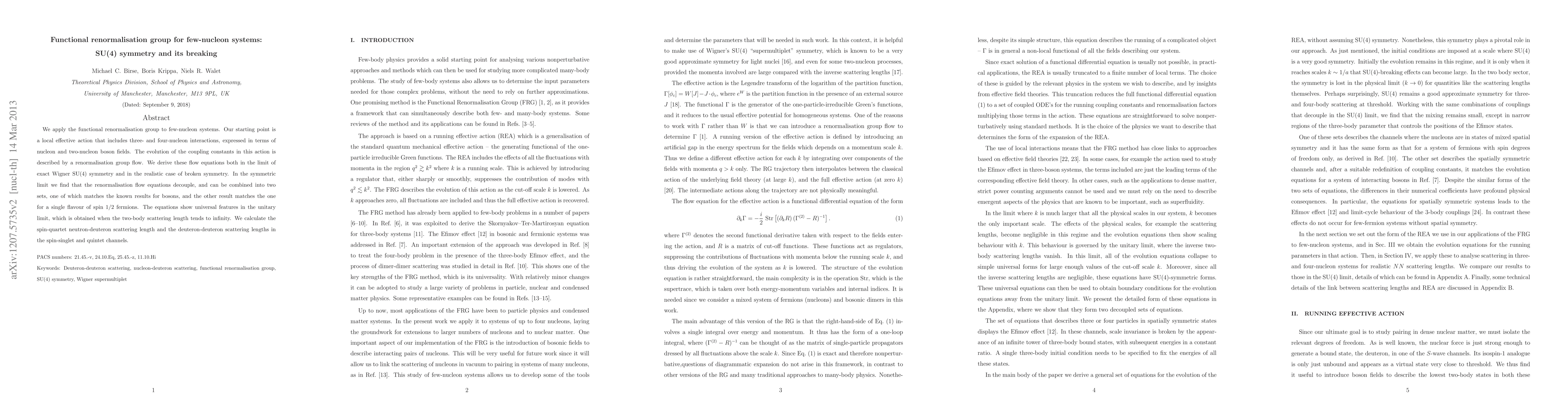 This paper applies functional renormalisation group methods to few-nucleon systems, deriving flow equations for both symmetric and broken SU(4) symmetry scenarios. The study reveals decoupling in the symmetric limit and calculates scattering lengths for neutron-deuteron and deuteron-deuteron interactions.