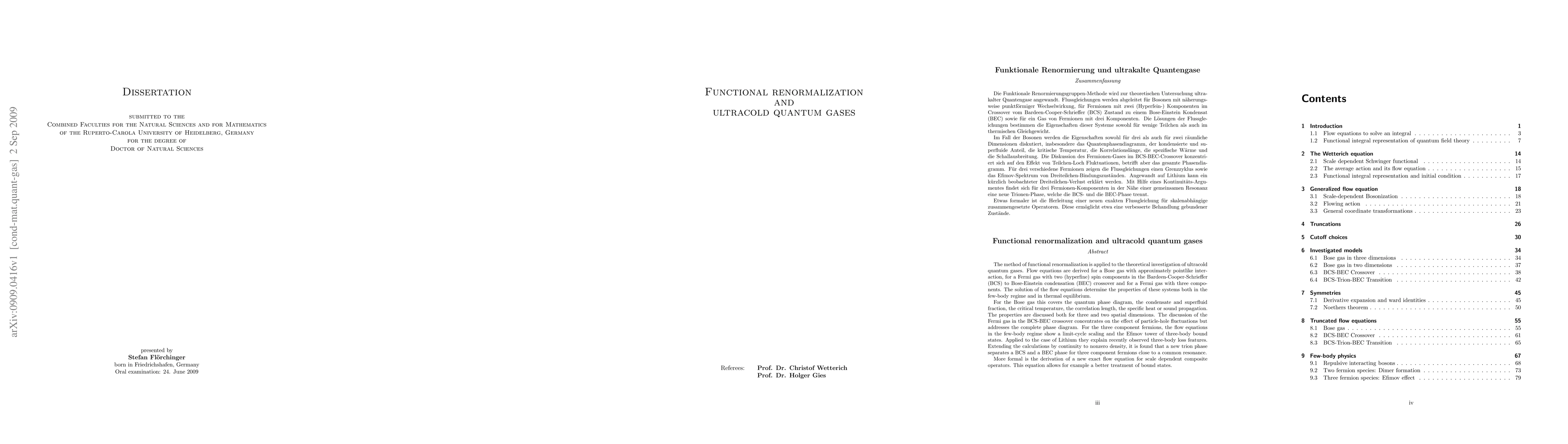 The method of functional renormalization is applied to the theoretical investigation of ultracold quantum gases. Flow equations are derived for a Bose gas with approximately pointlike interaction, for a Fermi gas with two (hyperfine) spin components in the Bardeen-Cooper-Schrieffer (BCS) to Bose-Einstein condensation (BEC) crossover and for a Fermi gas with three components. The solution of the flow equations determine the properties of these systems both in the few-body regime and in thermal equilibrium. For the Bose gas this covers the quantum phase diagram, the condensate and superfluid fraction, the critical temperature, the correlation length, the specific heat or sound propagation. The properties are discussed both for three and two spatial dimensions. The discussion of the Fermi gas in the BCS-BEC crossover concentrates on the effect of particle-hole fluctuations but addresses the complete phase diagram. For the three component fermions, the flow equations in the few-body regime show a limit-cycle scaling and the Efimov tower of three-body bound states. Applied to the case of Lithium they explain recently observed three-body loss features. Extending the calculations by continuity to nonzero density, it is found that a new trion phase separates a BCS and a BEC phase for three component fermions close to a common resonance. More formal is the derivation of a new exact flow equation for scale dependent composite operators. This equation allows for example a better treatment of bound states.