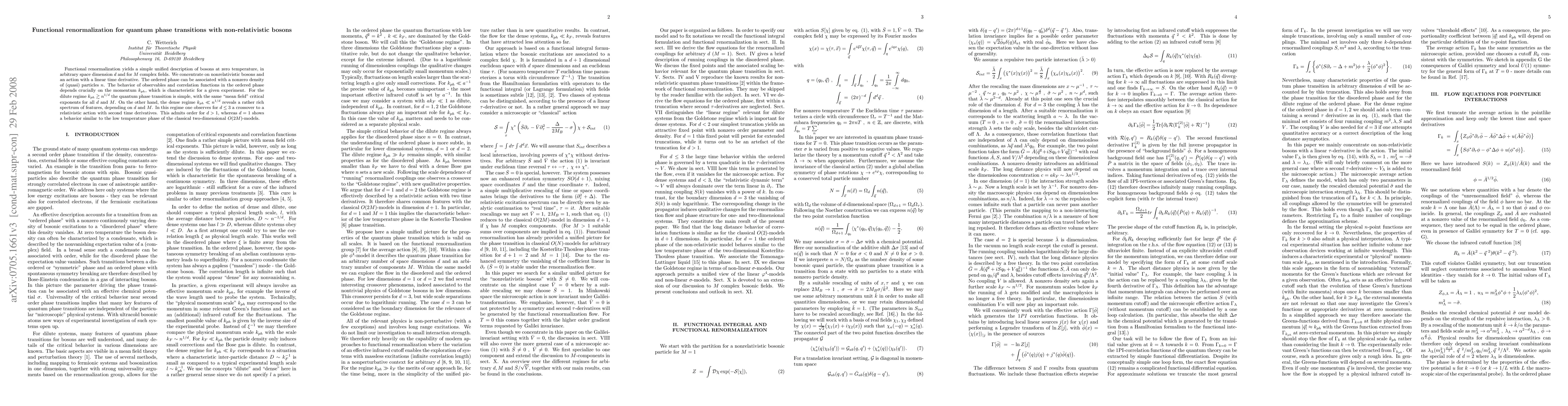 Functional renormalization yields a simple unified description of bosons at zero temperature, in arbitrary space dimension $d$ and for $M$ complex fields. We concentrate on nonrelativistic bosons and an action with a linear time derivative. The ordered phase can be associated with a nonzero density of (quasi) particles $n$. The behavior of observables and correlation functions in the ordered phase depends crucially on the momentum $k_{ph}$, which is characteristic for a given experiment. For the dilute regime $k_{ph}\gtrsim n^{1/d}$ the quantum phase transition is simple, with the same ``mean field'' critical exponents for all $d$ and $M$. On the other hand, the dense regime $k_{ph}\ll n^{1/d}$ reveals a rather rich spectrum of features, depending on $d$ and $M$. In this regime one observes for $d\leq 3$ a crossover to a relativistic action with second time derivatives. This admits order for $d>1$, whereas $d=1$ shows a behavior similar to the low temperature phase of the classical two-dimensional $O(2M)$-models.
