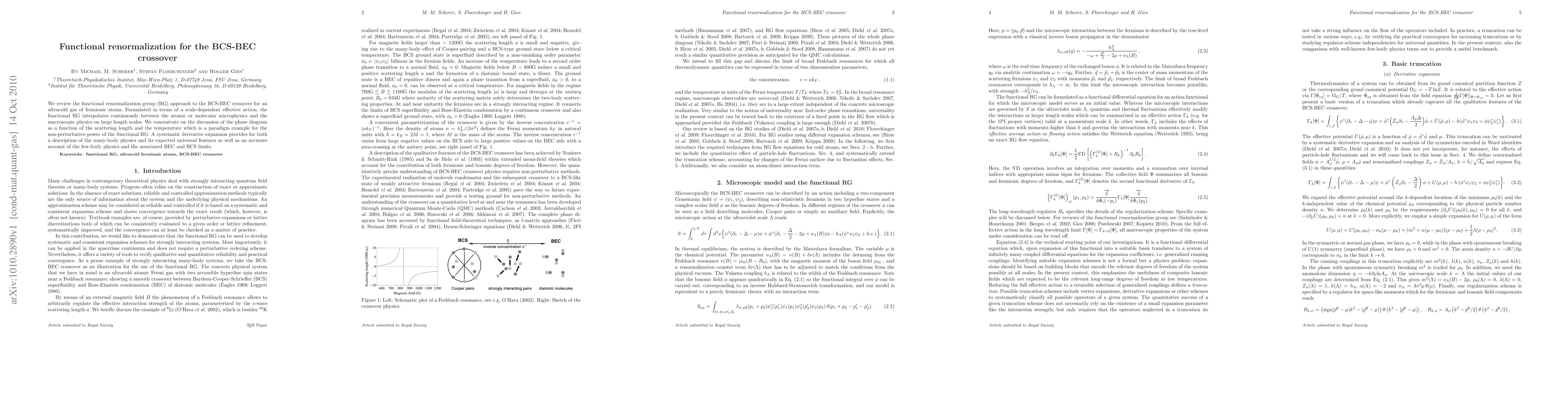 This paper reviews the functional renormalization group approach to the BCS-BEC crossover in ultracold fermionic gases, focusing on the phase diagram as a function of scattering length and temperature. The method provides a continuous interpolation between microscopic and macroscopic physics, offering insights into both many-body and few-body systems.