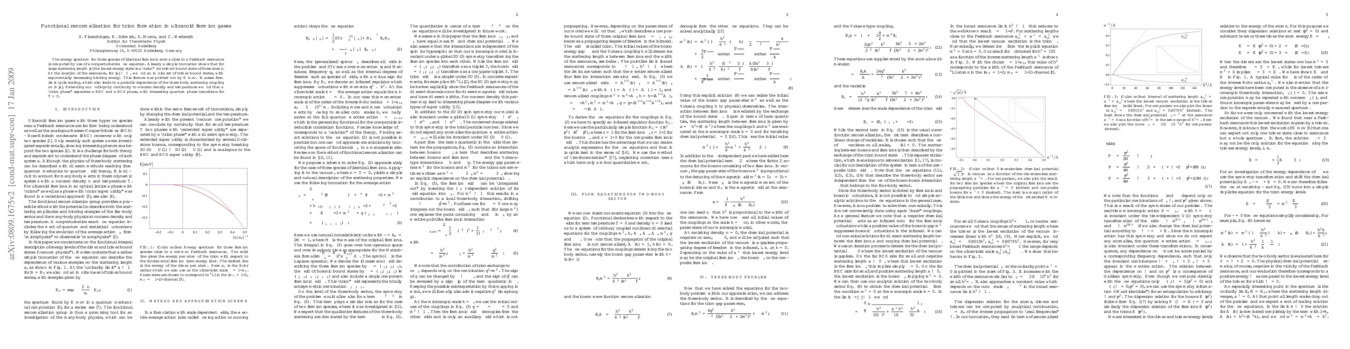 The energy spectrum for three species of identical fermionic atoms close to a Feshbach resonance is computed by use of a nonperturbative flow equation. Already a simple truncation shows that for large scattering length $|a|$ the lowest energy state is a "trion" (or trimer) bound state of three atoms. At the location of the resonance, for $|a|\to\infty$, we find an infinite set of trimer bound states, with exponentially decreasing binding energy. This feature was pointed out by Efimov. It arises from limit cycle scaling, which also leads to a periodic dependence of the three body scattering coupling on $\ln |a|$. Extending our findings by continuity to nonzero density and temperature we find that a "trion phase" separates a BEC and a BCS phase, with interesting quantum phase transitions for T=0.