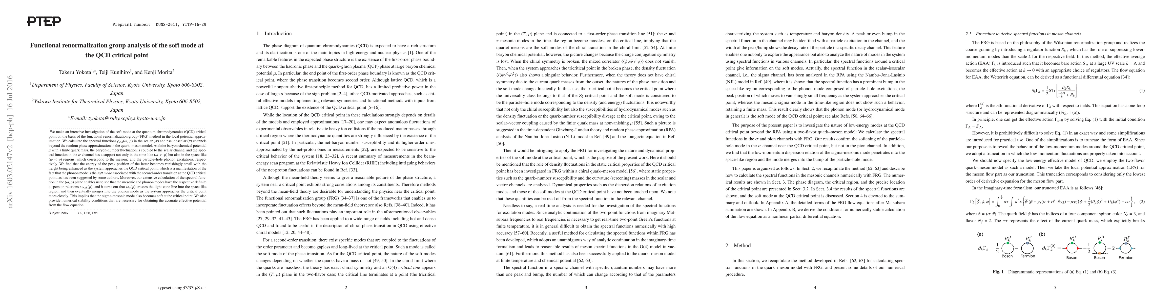 We make an intensive investigation of the soft mode at the quantum chromodynamics (QCD) critical point on the basis of the functional renormalization group (FRG) method in the local potential approximation. We calculate the spectral functions $\rho_{\sigma, \pi}(\omega,\, p)$ in the scalar ($\sigma$) and pseudoscalar ($\pi$) channels beyond the random phase approximation in the quark--meson model. At finite baryon chemical potential $\mu$ with a finite quark mass, the baryon-number fluctuation is coupled to the scalar channel and the spectral function in the $\sigma$ channel has a support not only in the time-like ($\omega\,>\,p$) but also in the space-like ($\omega\,<\, p$) regions, which correspond to the mesonic and the particle--hole phonon excitations, respectively. We find that the energy of the peak position of the latter becomes vanishingly small with the height being enhanced as the system approaches the QCD critical point, which is a manifestation of the fact that the phonon mode is the {\em soft mode} associated with the second-order transition at the QCD critical point, as has been suggested by some authors. Moreover, our extensive calculation of the spectral function in the $(\omega, p)$ plane enables us to see that the mesonic and phonon modes have the respective definite dispersion relations $\omega_{\sigma.{\rm ph}}(p)$, and it turns out that $\omega_{\sigma}(p)$ crosses the light-cone line into the space-like region, and then eventually merges into the phonon mode as the system approaches the critical point more closely. This implies that the sigma-mesonic mode also becomes soft at the critical point. We also provide numerical stability conditions that are necessary for obtaining the accurate effective potential from the flow equation.