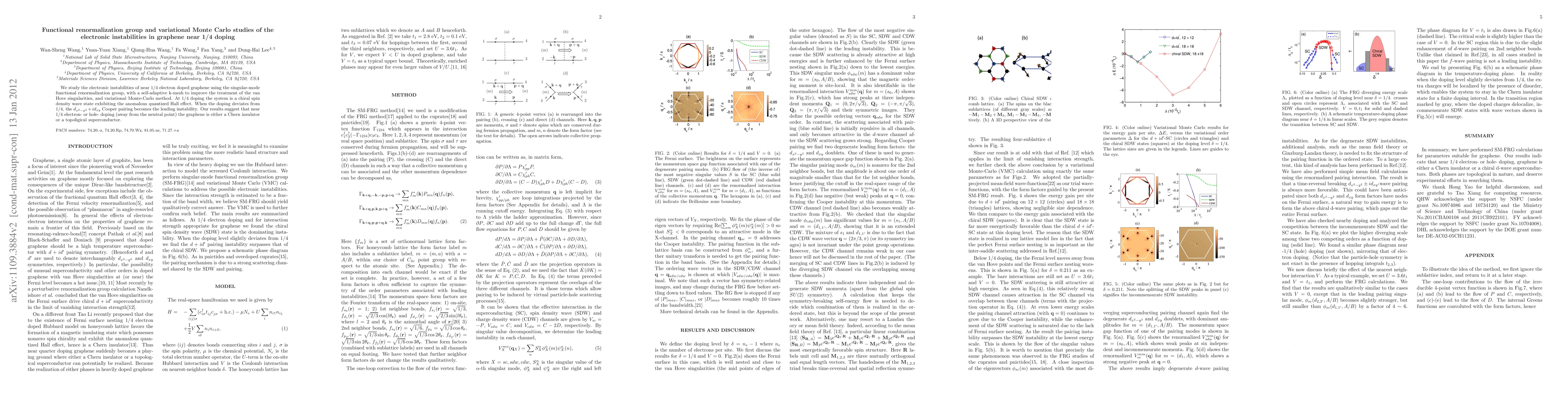 This paper investigates the electronic instabilities in graphene near 1/4 doping using functional renormalization group and variational Monte Carlo methods, revealing a chiral spin density wave state at 1/4 doping and $d_{x^2-y^2}+i d_{xy}$ Cooper pairing for deviations, suggesting graphene as a promising material for Chern insulators and superconductors.