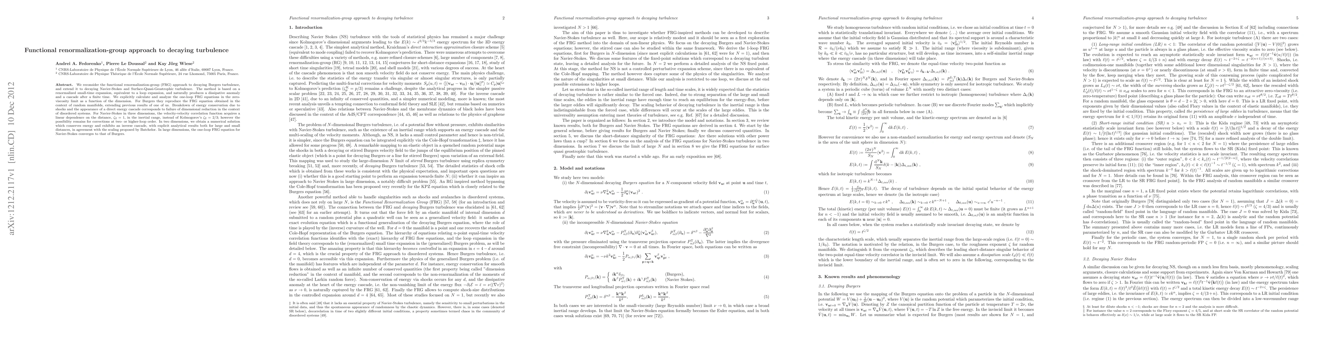 This paper extends the functional renormalization-group approach to analyze decaying turbulence in Burgers, Navier-Stokes, and Surface-Quasi-Geostrophic systems, revealing a dissipative anomaly and cascade after finite time. It finds a linear distance dependence in the velocity-velocity correlation function for three-dimensional Navier-Stokes turbulence, contrasting with Kolmogorov's law.