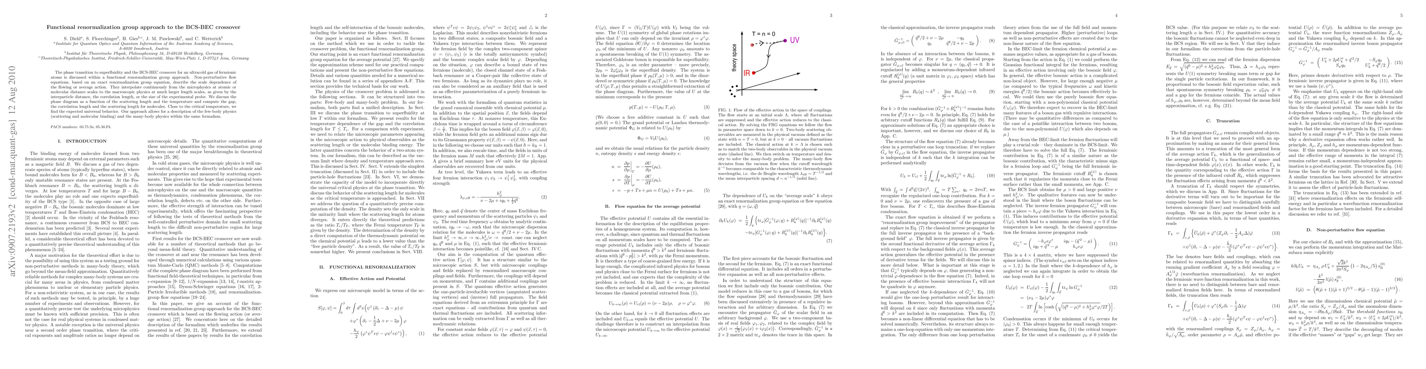 This paper employs a functional renormalization group approach to study the BCS-BEC crossover in ultracold fermionic gases, providing a continuous description from atomic to macroscopic scales. The method reveals universal behavior near the critical temperature and integrates both few-body and many-body physics within a unified framework.