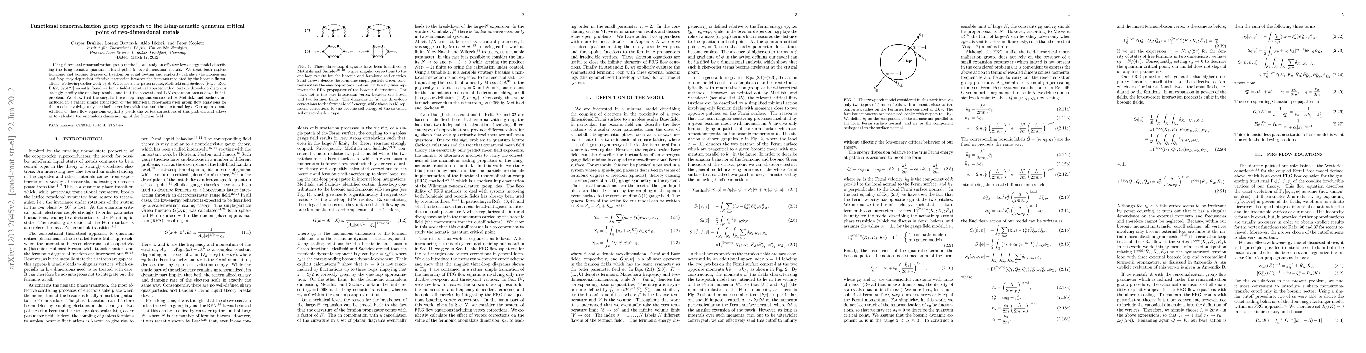 This paper uses functional renormalization group methods to study the Ising-nematic quantum critical point in two-dimensional metals, treating both fermionic and bosonic degrees of freedom. It shows that the functional renormalization group approach naturally includes singular three-loop diagrams, providing vertex corrections and calculating the anomalous dimension $\eta_{\psi}$ of the fermion field.