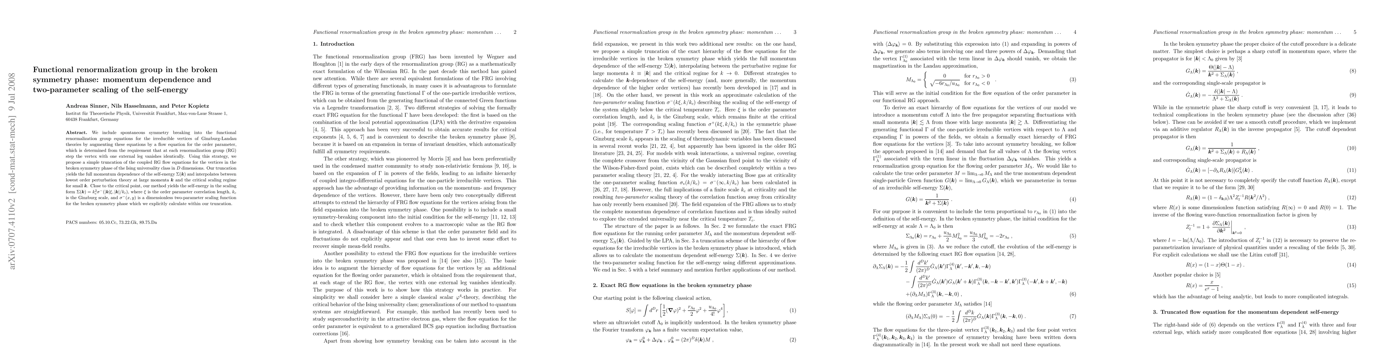 This paper proposes a functional renormalization group approach to study the broken symmetry phase, incorporating spontaneous symmetry breaking through a flow equation for the order parameter. The method provides the full momentum dependence of the self-energy and yields a two-parameter scaling function, bridging perturbation theory and critical scaling regimes.