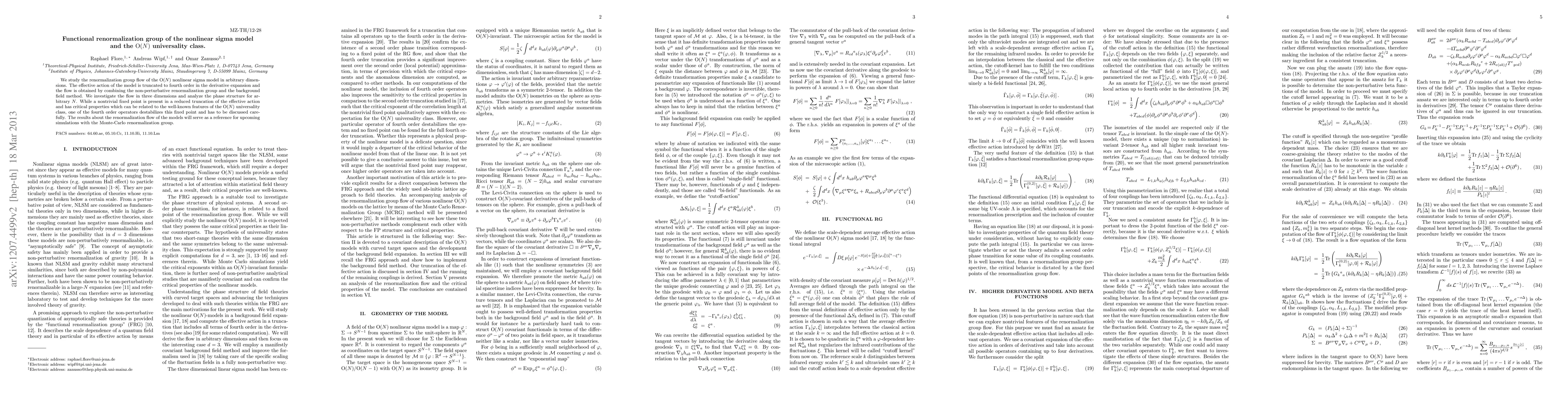This research investigates the renormalization group flow of the O(N) non-linear sigma model using the non-perturbative renormalization group and the background field method. The analysis focuses on three dimensions and the model's phase structure for arbitrary N, providing critical properties for future Monte-Carlo simulations.