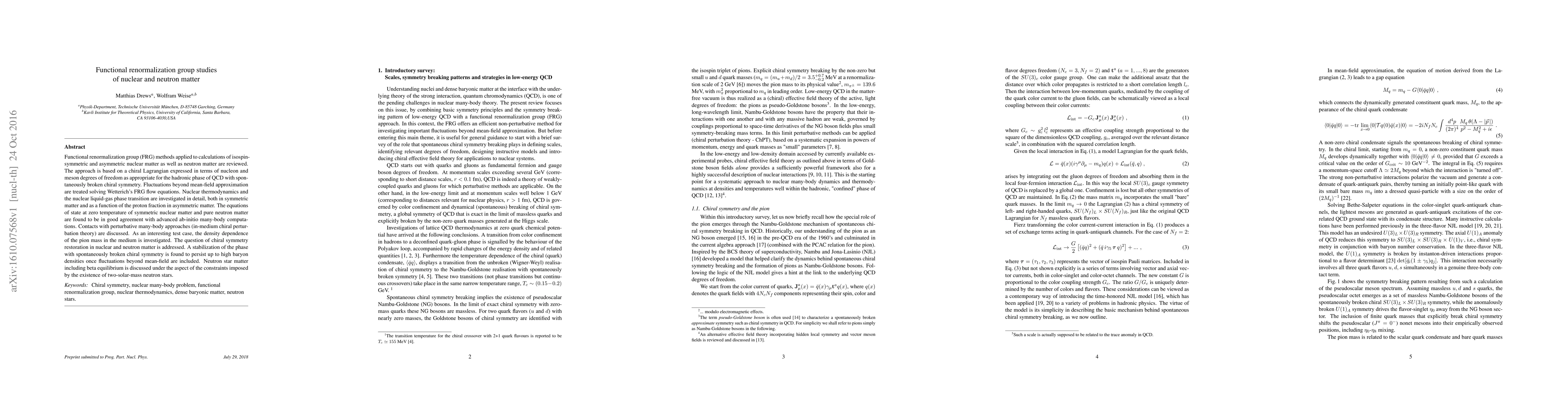 This paper reviews the application of functional renormalization group (FRG) methods to nuclear and neutron matter, focusing on thermodynamics and phase transitions. It finds good agreement between FRG results and advanced ab-initio computations, and discusses the density dependence of the pion mass and chiral symmetry restoration in nuclear matter.