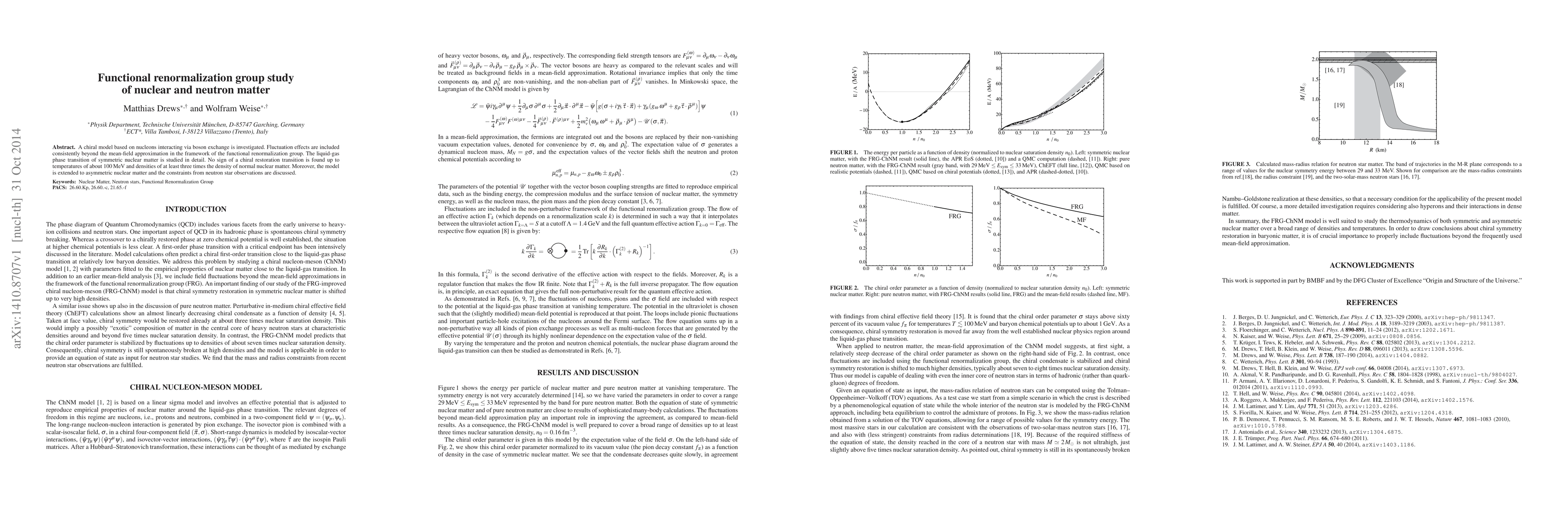 A chiral model based on nucleons interacting via boson exchange is investigated. Fluctuation effects are included consistently beyond the mean-field approximation in the framework of the functional renormalization group. The liquid-gas phase transition of symmetric nuclear matter is studied in detail. No sign of a chiral restoration transition is found up to temperatures of about 100 MeV and densities of at least three times the density of normal nuclear matter. Moreover, the model is extended to asymmetric nuclear matter and the constraints from neutron star observations are discussed.