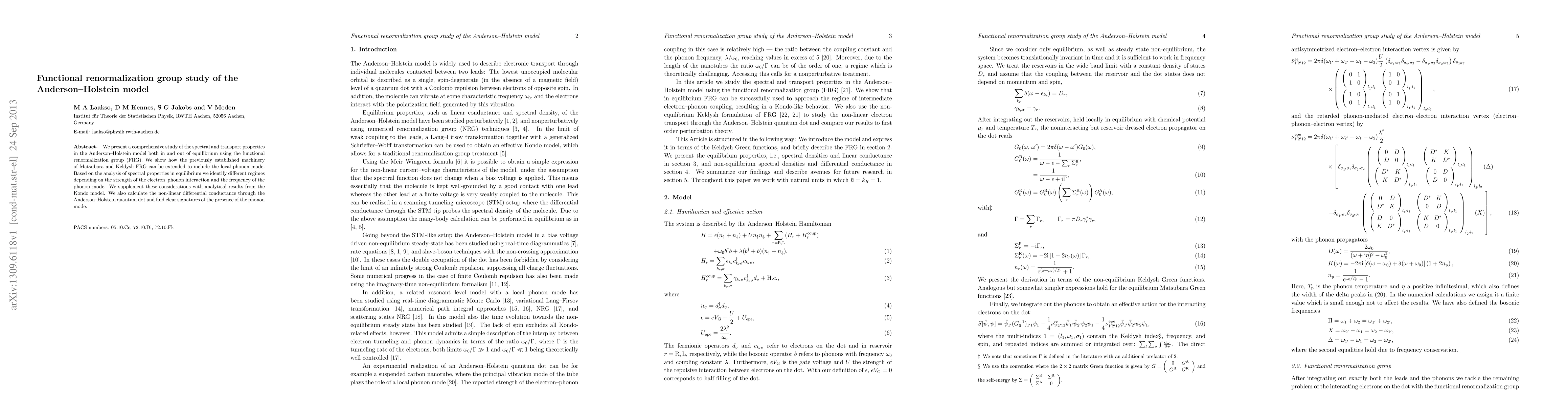 We present a comprehensive study of the spectral and transport properties in the Anderson--Holstein model both in and out of equilibrium using the functional renormalization group (FRG). We show how the previously established machinery of Matsubara and Keldysh FRG can be extended to include the local phonon mode. Based on the analysis of spectral properties in equilibrium we identify different regimes depending on the strength of the electron--phonon interaction and the frequency of the phonon mode. We supplement these considerations with analytical results from the Kondo model. We also calculate the non-linear differential conductance through the Anderson--Holstein quantum dot and find clear signatures of the presence of the phonon mode.