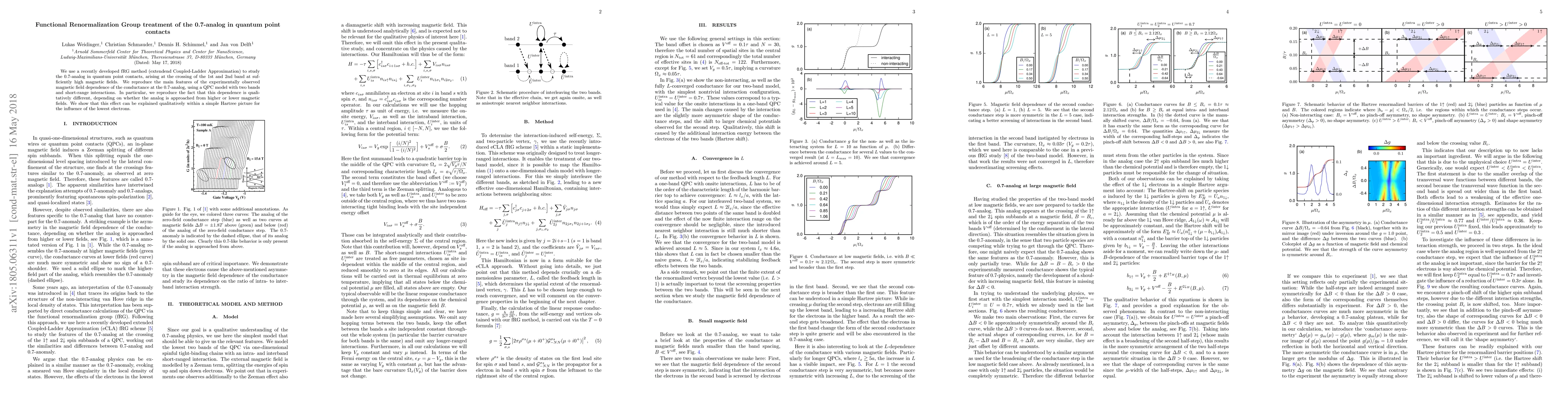 We use a recently developed fRG method (extendend Coupled-Ladder Approximation) to study the 0.7-analog in quantum point contacts, arising at the crossing of the 1st and 2nd band at suf- ficiently high magnetic fields. We reproduce the main features of the experimentally observed magnetic field dependence of the conductance at the 0.7-analog, using a QPC model with two bands and short-range interactions. In particular, we reproduce the fact that this dependence is quali- tatively different, depending on whether the analog is approached from higher or lower magnetic fields. We show that this effect can be explained qualitatively within a simple Hartree picture for the influence of the lowest electrons.