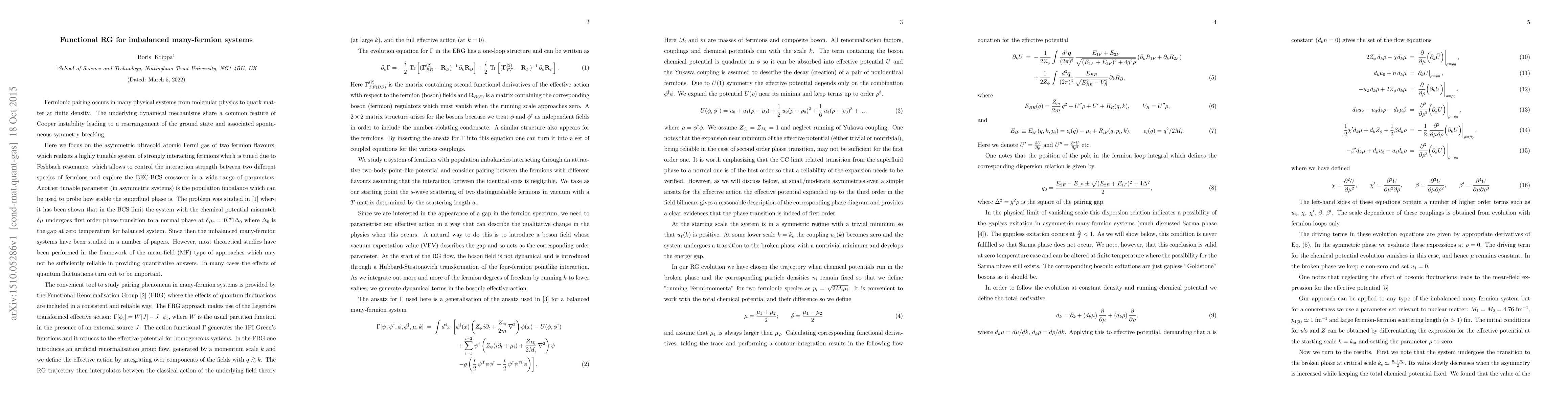 Summary: The Functional Renormalisation Group method reveals a first-order phase transition in imbalanced many-fermion systems as density mismatch exceeds critical values, with implications for studying nuclear/quark matter using fermionic cold atoms.