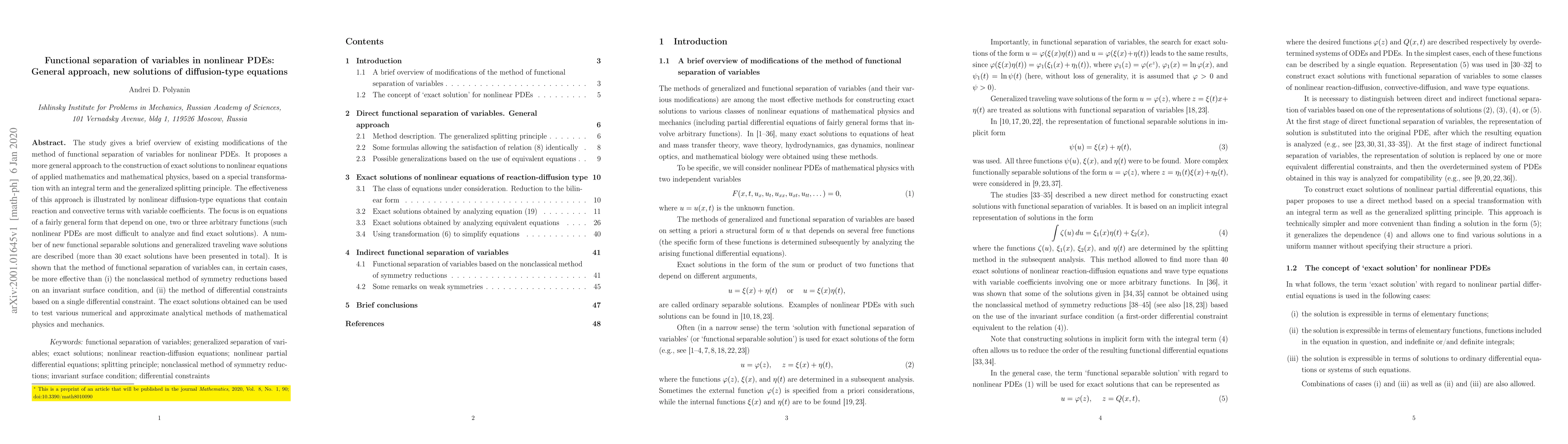 The study gives a brief overview of existing modifications of the method of functional separation of variables for nonlinear PDEs. It proposes a more general approach to the construction of exact solutions to nonlinear equations of applied mathematics and mathematical physics, based on a special transformation with an integral term and the generalized splitting principle. The effectiveness of this approach is illustrated by nonlinear diffusion-type equations that contain reaction and convective terms with variable coefficients. The focus is on equations of a fairly general form that depend on one, two or three arbitrary functions (such nonlinear PDEs are most difficult to analyze and find exact solutions). A number of new functional separable solutions and generalized traveling wave solutions are described (more than 30 exact solutions have been presented in total). It is shown that the method of functional separation of variables can, in certain cases, be more effective than (i) the nonclassical method of symmetry reductions based on an invariant surface condition, and (ii) the method of differential constraints based on a single differential constraint. The exact solutions obtained can be used to test various numerical and approximate analytical methods of mathematical physics and mechanics.