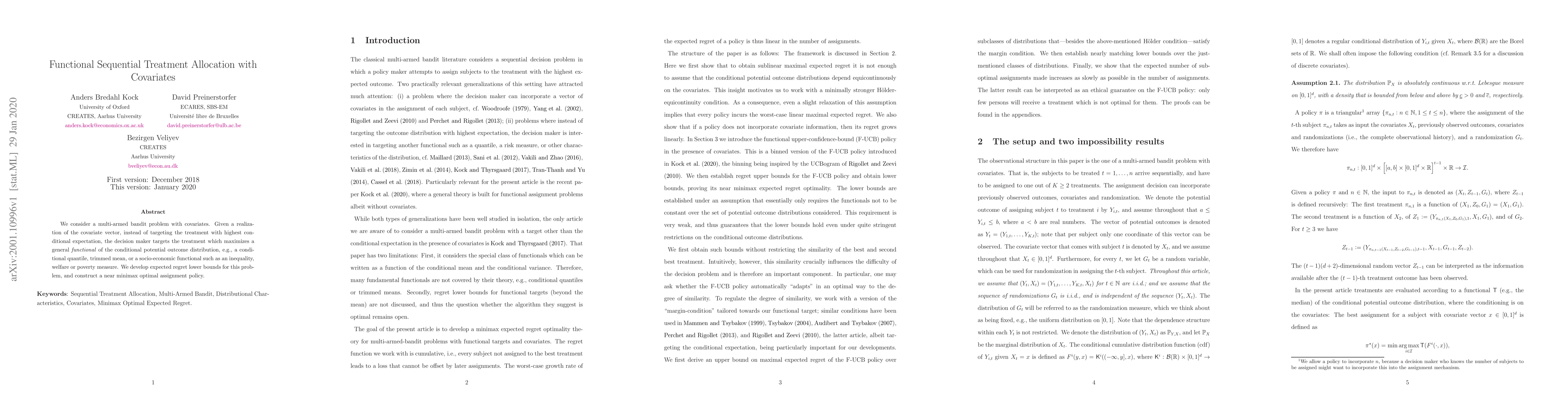 Researchers developed a new approach for multi-armed bandit problems that incorporates covariates and functional outcomes, aiming to improve decision-making with more robust and nuanced measures of effectiveness. The study provides expected regret lower bounds and near-minimax optimal assignment policies for this problem.