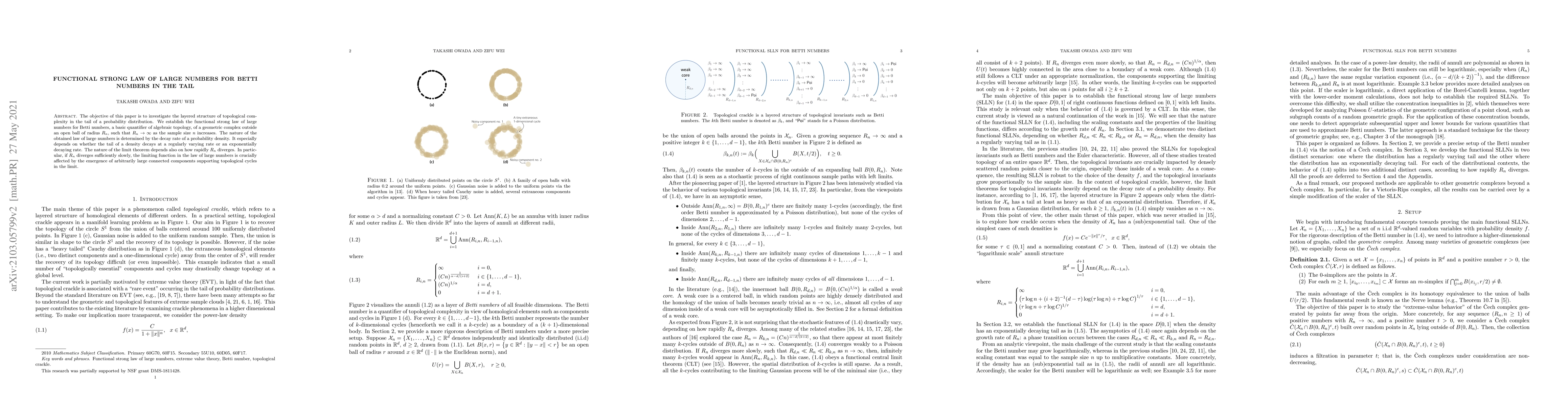 This paper establishes a functional strong law of large numbers for Betti numbers, quantifying topological complexity, in the tail of a probability distribution. The law's nature hinges on the decay rate of the probability density and the divergence rate of the radius $R_n$, with slow divergence potentially leading to the emergence of large connected components.