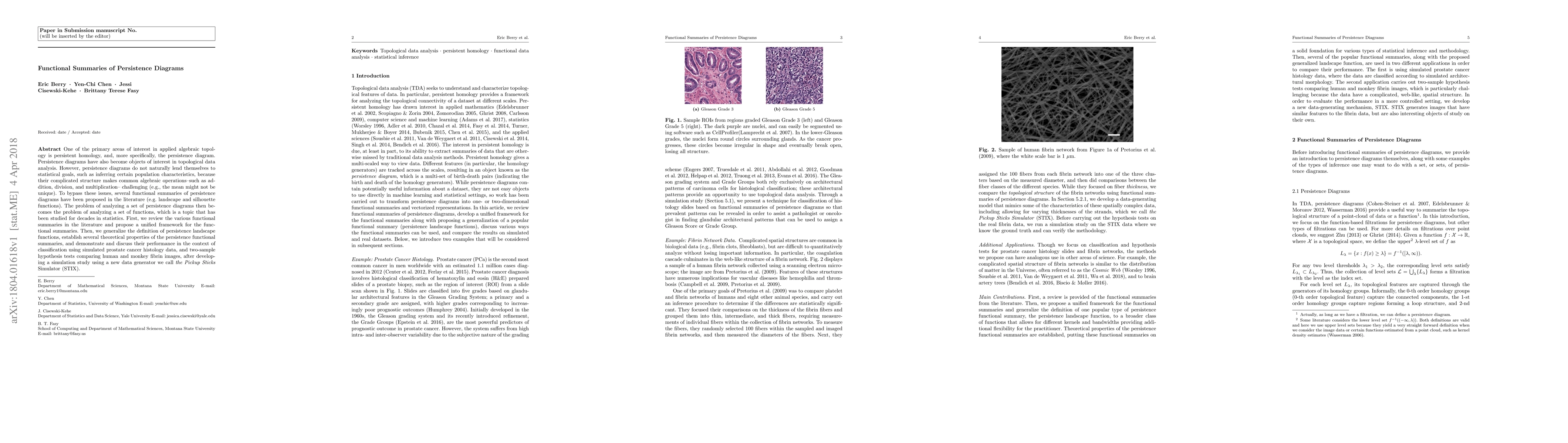 This paper reviews functional summaries of persistence diagrams, proposes a unified framework for these summaries, and generalizes the persistence landscape functions. It demonstrates their effectiveness in classification and hypothesis testing using prostate cancer and fibrin images, supported by a new data generator called the Pickup Sticks Simulator (STIX).