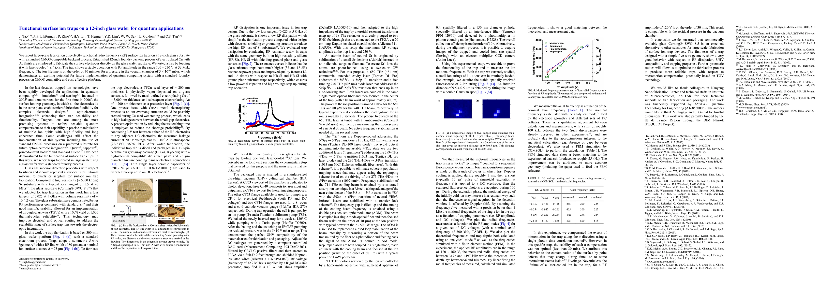 This paper reports the fabrication of RF surface ion traps on a 12-inch glass wafer using a CMOS-compatible process, showing stable operation with laser-cooled Sr+ ions and a potential for quantum computing applications. The ion trap demonstrates a long lifetime of 30 minutes under vacuum conditions, indicating its viability for future quantum systems.