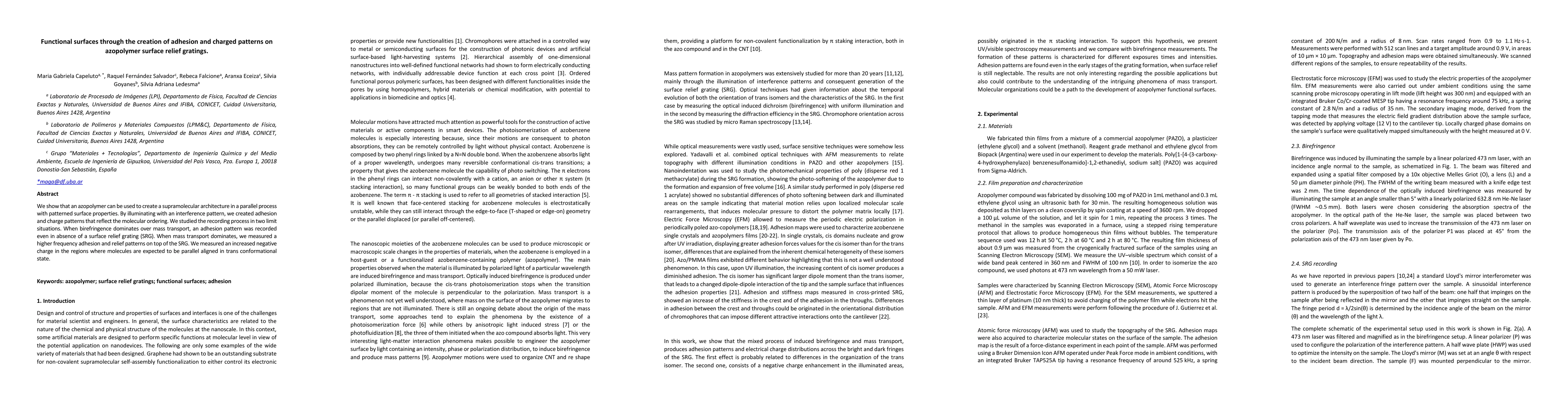 Researchers created functional surfaces using azopolymer with patterned surface properties through interference illumination, resulting in adhesion patterns even without a relief grating and increased negative charge.