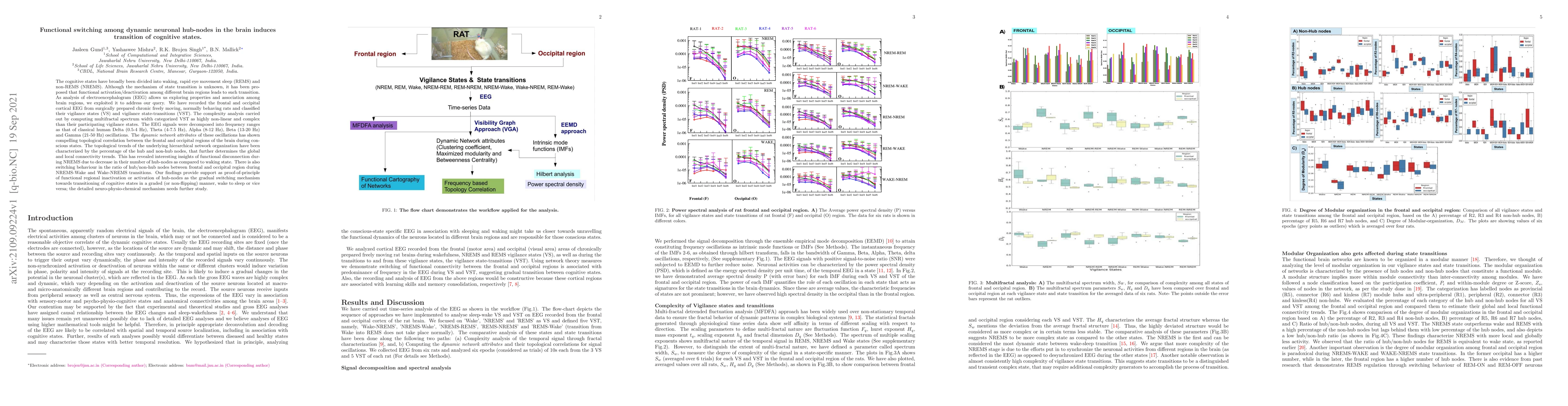 The cognitive states have broadly been divided into waking, rapid eye movement sleep and non-REMS. Although the mechanism of state transition is unknown, it has been proposed that functional activation/deactivation among different brain regions leads to such transition. As analysis of electroencephalogram allows us exploring properties and association among brain regions, we exploited it to address our query. We have recorded the frontal and occipital cortical EEG from surgically prepared chronic freely moving, normally behaving rats and classified their vigilance states and vigilance state-transitions. The complexity analysis carried out by computing multifractal spectrum width categorized VST as highly non-linear and complex than their participating vigilance states. The EEG signals were decomposed into frequency ranges as that of classical human Delta, Theta, Alpha, Beta and Gamma oscillations. The dynamic network attributes of these oscillations has shown compelling topological correlation between the frontal and occipital regions of the brain during conscious states. The topological trends of the underlying hierarchical network organization have been characterized by the percentage of the hub and non-hub nodes, that further determines the global and local connectivity trends. This has revealed interesting insights of functional disconnection during NREMS due to decrease in their number of hub-nodes as compared to waking state. There is also switching behaviour in the ratio of hub/non-hub nodes between frontal and occipital region during NREMS-Wake and Wake-NREMS transitions. Our findings provide support as proof-of-principle of functional regional inactivation or activation of hub-nodes as the gradual switching mechanism towards transitioning of cognitive states in a graded manner, wake to sleep or vice versa; the detailed neuro-physio-chemical mechanism needs further study.