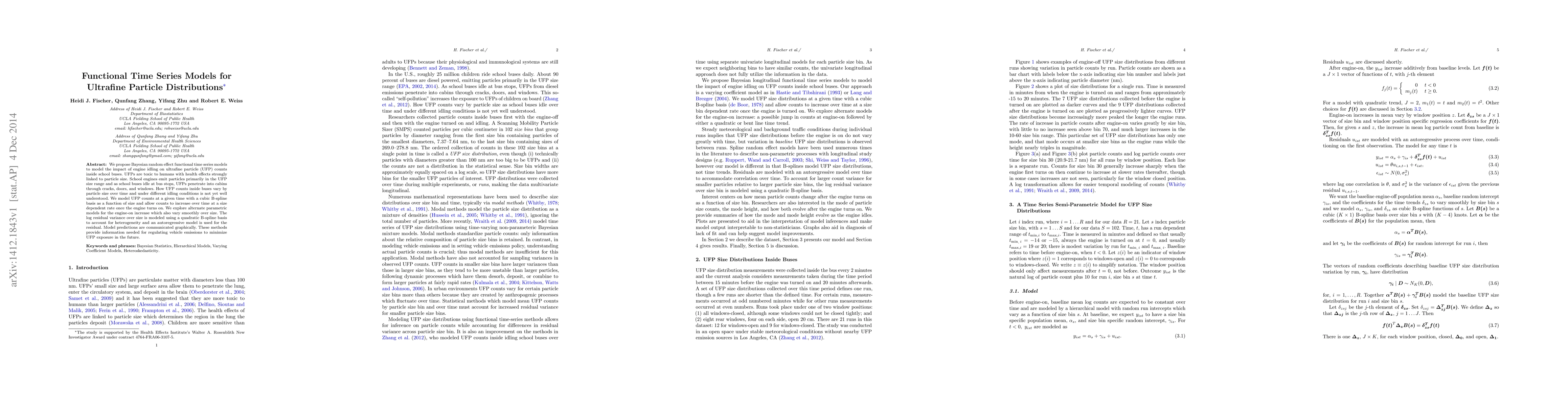 We propose Bayesian random effect functional time series models to model the impact of engine idling on ultrafine particle (UFP) counts inside school buses. UFPs are toxic to humans with health effects strongly linked to particle size. School engines emit particles primarily in the UFP size range and as school buses idle at bus stops, UFPs penetrate into cabins through cracks, doors, and windows. How UFP counts inside buses vary by particle size over time and under different idling conditions is not yet well understood. We model UFP counts at a given time with a cubic B-spline basis as a function of size and allow counts to increase over time at a size dependent rate once the engine turns on. We explore alternate parametric models for the engine-on increase which also vary smoothly over size. The log residual variance over size is modeled using a quadratic B-spline basis to account for heterogeneity and an autoregressive model is used for the residual. Model predictions are communicated graphically. These methods provide information needed for regulating vehicle emissions to minimize UFP exposure in the future.