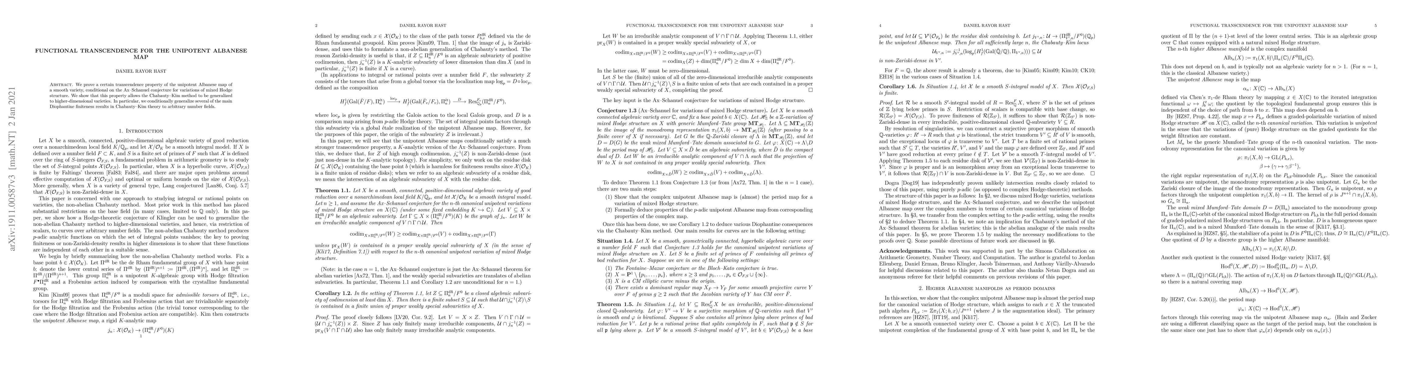 This paper proves a transcendence property for the unipotent Albanese map of smooth varieties, contingent on the Ax-Schanuel conjecture. It also extends the Chabauty-Kim method to higher dimensions, thereby generalizing key Diophantine finiteness results to arbitrary number fields.
