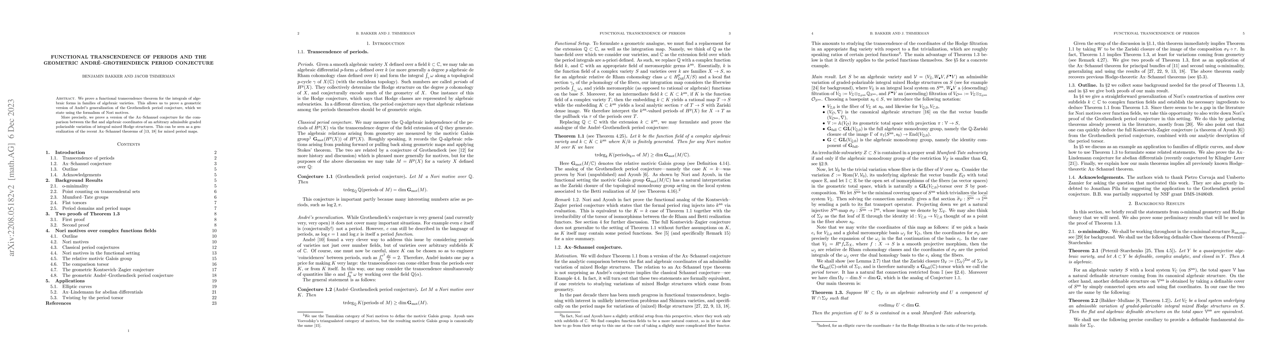 This paper proves a functional transcendence theorem for integrals of algebraic forms, enabling a geometric proof of Andr\'e's generalization of the Grothendieck period conjecture using Nori motives. It also establishes a version of the Ax--Schanuel conjecture for admissible graded polarizable variations of mixed Hodge structures, extending recent results on mixed period maps.