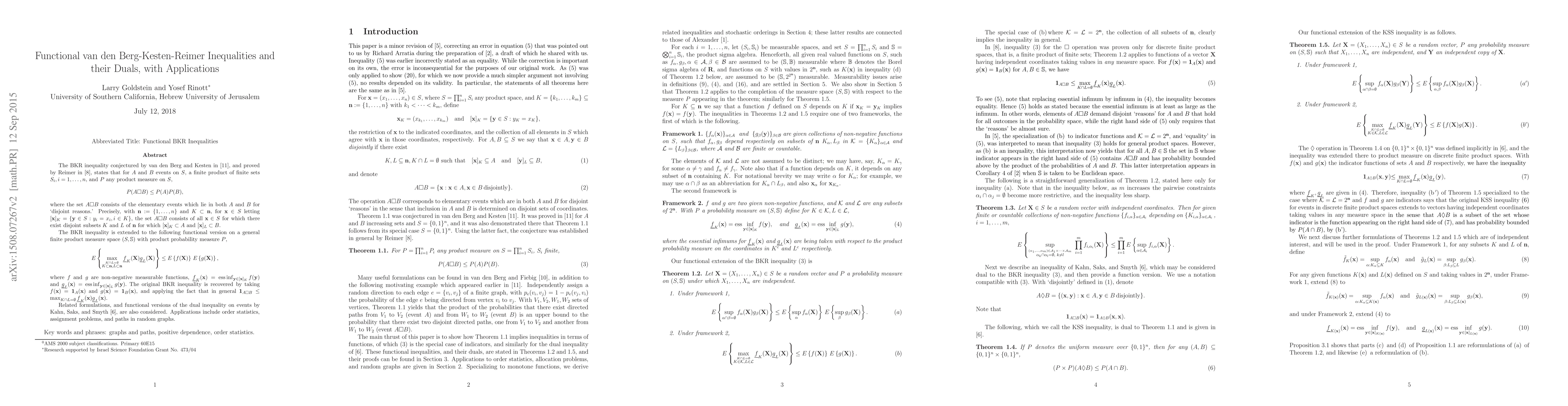 The BKR inequality conjectured by van den Berg and Kesten in [11], and proved by Reimer in [8], states that for $A$ and $B$ events on $S$, a finite product of finite sets $S_i,i=1,\ldots,n$, and $P$ any product measure on $S$, $$ P(A \Box B) \le P(A)P(B),$$ where the set $A \Box B$ consists of the elementary events which lie in both $A$ and $B$ for `disjoint reasons.' Precisely, with ${\bf n}:=\{1,\ldots,n\}$ and $K \subset {\bf n}$, for ${\bf x} \in S$ letting $[{\bf x}]_K=\{{\bf y} \in S: y_i = x_i, i \in K\}$, the set $A \Box B$ consists of all ${\bf x} \in S$ for which there exist disjoint subsets $K$ and $L$ of ${\bf n}$ for which $[{\bf x}]_K \subset A$ and $[{\bf x}]_L \subset B$. The BKR inequality is extended to the following functional version on a general finite product measure space $(S,\mathbb{S})$ with product probability measure $P$, $$E\left\{ \max_{\stackrel{K \cap L = \emptyset}{K \subset {\bf n}, L \subset {\bf n}}} \underline{f}_K({\bf X})\underline{g}_L({\bf X})\right\} \leq E\left\{f({\bf X})\right\}\,E\left\{g({\bf X})\right\},$$ where $f$ and $g$ are non-negative measurable functions, $\underline{f}_K({\bf x}) = {\rm ess} \inf_{{\bf y} \in [{\bf x}]_K}f({\bf y})$ and $\underline{g}_L({\bf x}) = {\rm ess} \inf_{{\bf y} \in [{\bf x}]_L}g({\bf y}).$ The original BKR inequality is recovered by taking $f({\bf x})={\bf 1}_A({\bf x})$ and $g({\bf x})={\bf 1}_B({\bf x})$, and applying the fact that in general ${\bf 1}_{A \Box B} \le \max_{K \cap L = \emptyset} \underline{f}_K({\bf x}) \underline{g}_L({\bf x})$. Related formulations, and functional versions of the dual inequality on events by Kahn, Saks, and Smyth [6], are also considered. Applications include order statistics, assignment problems, and paths in random graphs.