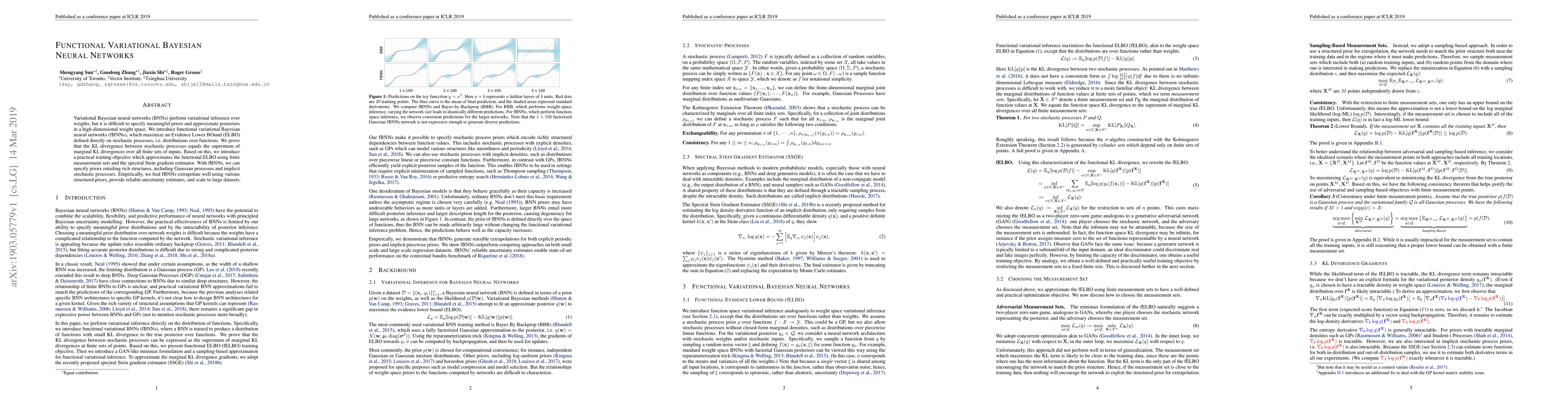 The paper proposes functional variational Bayesian neural networks (fBNNs) that maximize an Evidence Lower Bound directly on stochastic processes to address high-dimensional weight space inference issues. The authors introduce a practical training objective based on finite measurement sets and spectral Stein gradient, enabling well-structured priors like Gaussian processes, resulting in good extrapolation, reliable uncertainty estimates, and scalability to large datasets.