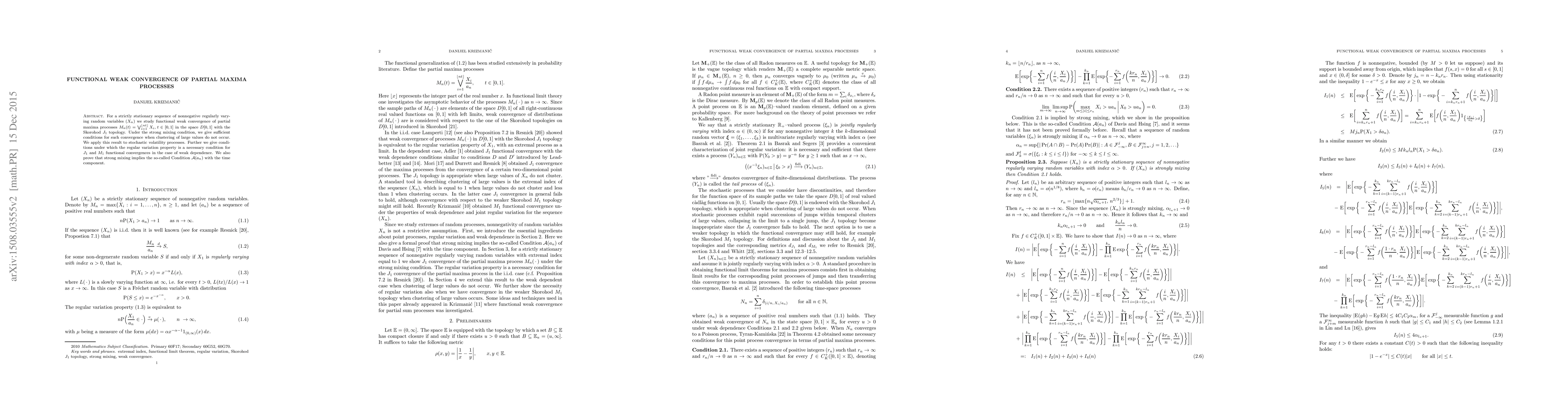 This paper investigates the functional weak convergence of partial maxima processes for a strictly stationary sequence of nonnegative regularly varying random variables under strong mixing conditions. It provides sufficient conditions for convergence in the Skorohod $J_{1}$ topology and applies these results to stochastic volatility processes, highlighting the necessity of regular variation for weak dependence scenarios.