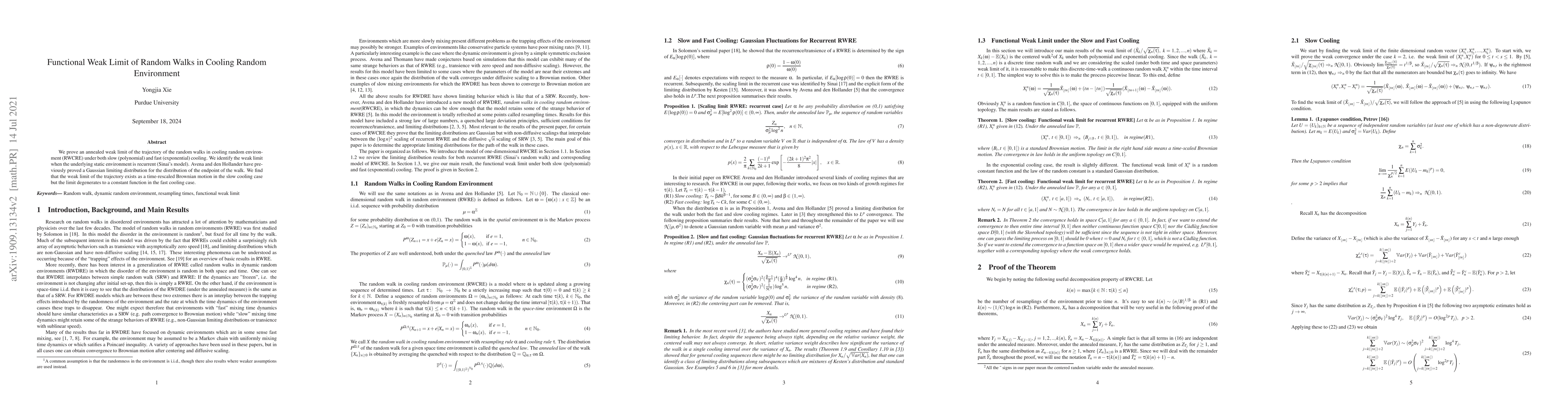 This paper proves the annealed weak limit of random walks in cooling random environments under different cooling rates, showing a time-rescaled Brownian motion for slow cooling but a constant function for fast cooling. This extends previous results on the law of large numbers and Gaussian fluctuations for such random walks.