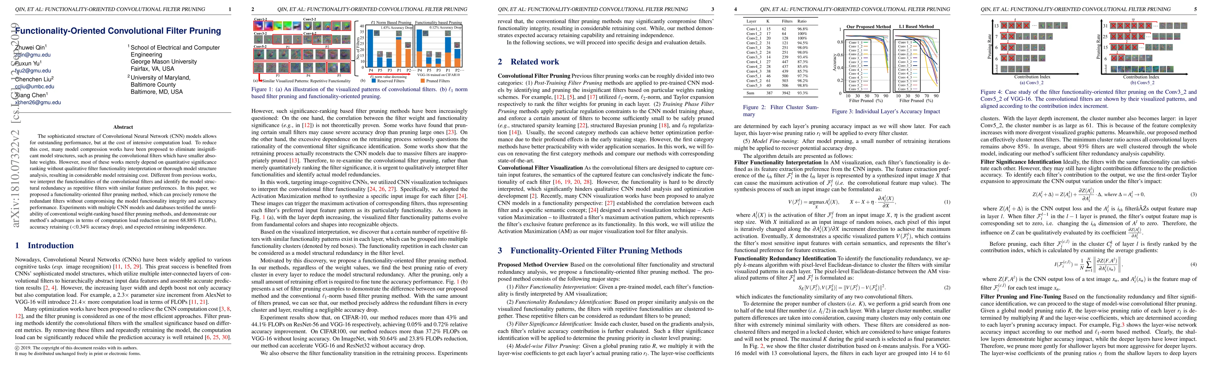 This paper proposes a functionality-oriented convolutional filter pruning method that interprets the qualitative significance of individual filters' specific functionalities, demonstrating significant redundancy due to repetitive functions. The approach offers superior computation cost optimization and interpretability compared to previous methods.