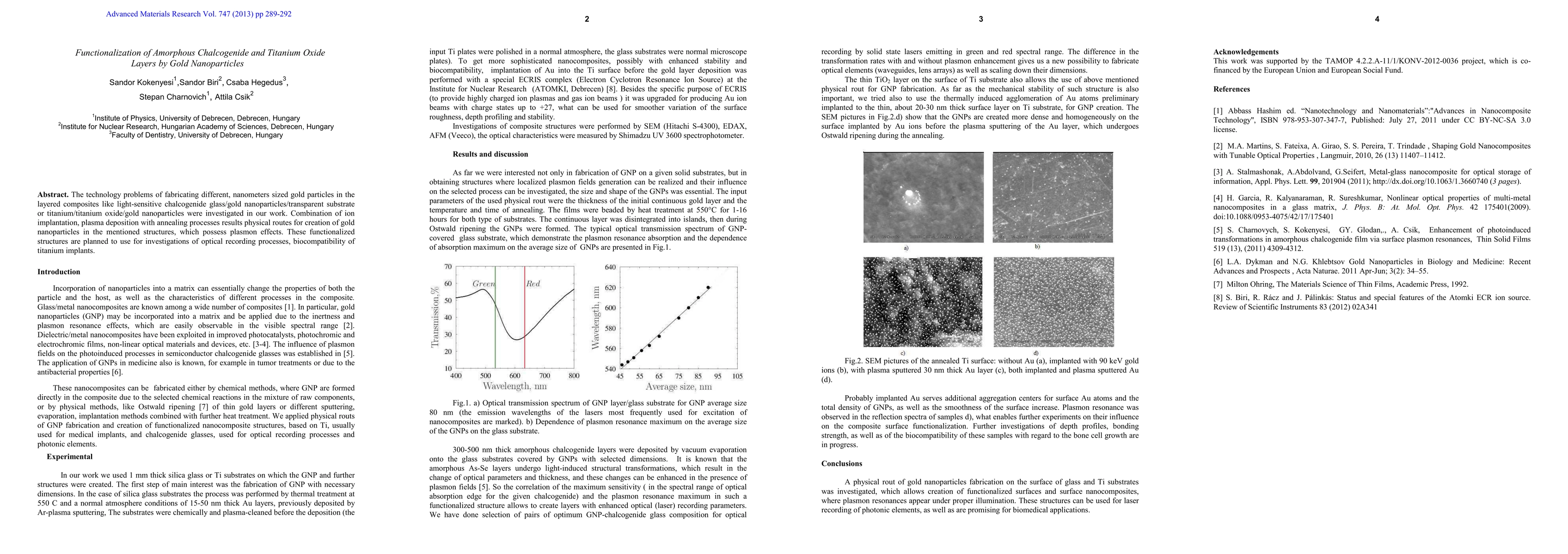 The technology problems of fabricating different, nanometers sized gold particles in the layered composites like light-sensitive chalcogenide glass/gold nanoparticles/transparent substrate or titanium/titanium oxide/gold nanoparticles were investigated in our work. Combination of ion implantation, plasma deposition with annealing processes results physical routes for creation of gold nanoparticles in the mentioned structures, which possess plasmon effects. These functionalized structures are planned to use for investigations of optical recording processes, biocompatibility of titanium implants.