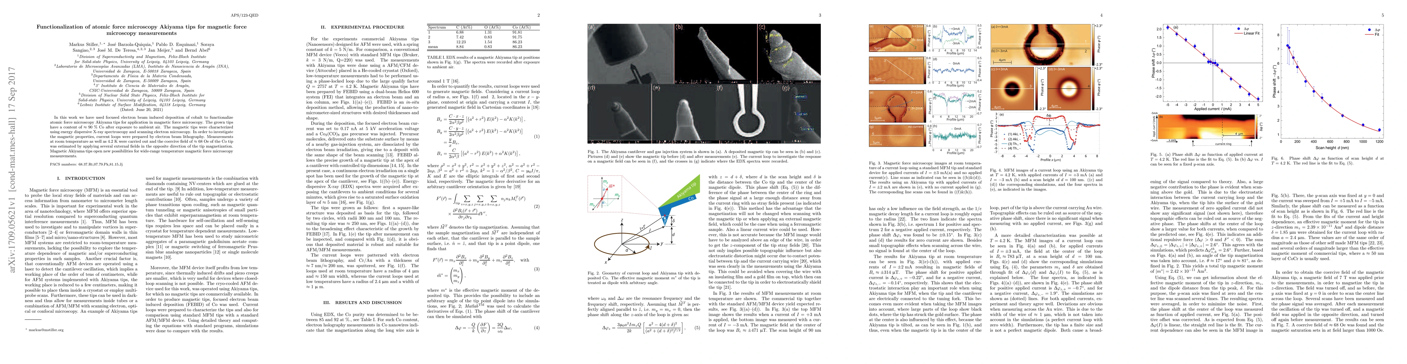 In this work we have used focused electron beam induced deposition of cobalt to functionalize atomic force microscopy Akiyama tips for application in magnetic force microscopy. The grown tips have a content of 90% Co after exposure to ambient air. The magnetic tips were characterized using energy dispersive X-ray spectroscopy and scanning electron microscopy. In order to investigate the magnetic properties, current loops were prepared by electron beam lithography. Measurements at room temperature as well as 4.2K were carried out and the coercive field of 68 Oe of the Co tip was estimated by applying several external fields in the opposite direction of the tip magnetization. Magnetic Akiyama tips open new possibilities for low to room-temperature magnetic force microscopy measurements.