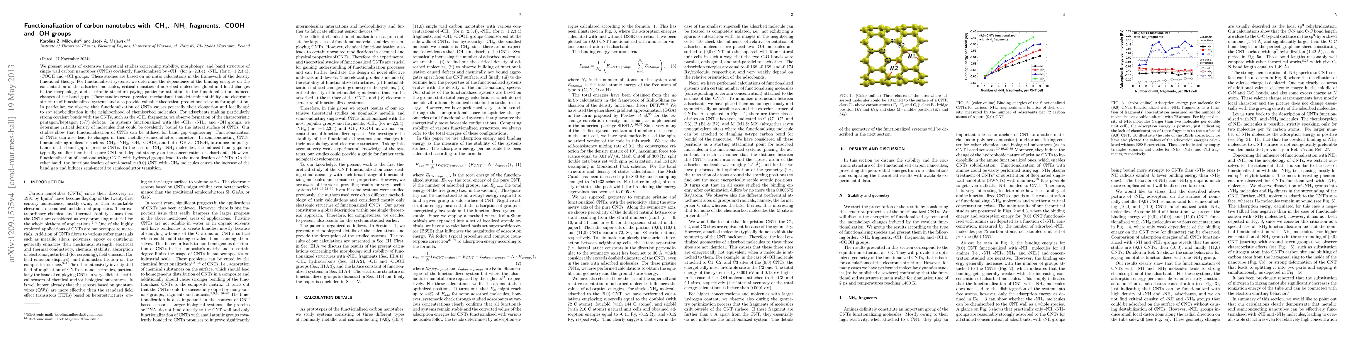 We present results of extensive theoretical studies concerning stability, morphology, and band structure of single wall carbon nanotubes (CNTs) covalently functionalized by -CHn(for n=2,3,4),-NHn(for n=1,2,3,4),-COOH and -OH groups. Our studies are based on ab initio calculations in the framework of the density functional theory. We determine the dependence of the binding energies on the concentration of the adsorbed molecules, critical densities of adsorbed molecules, global and local changes in the morphology, and electronic structure paying particular attention to the functionalization induced changes of the band gaps. These studies reveal physical mechanisms that determine stability and electronic structure of those systems and also provide valuable theoretical predictions relevant for application. Functionalization of CNTs causes generally their elongation and locally sp2 -> sp3 rehybridization in the neighborhood of chemisorbed groups. For adsorbants making particularly strong covalent bonds with the CNTs(-CH2), we observe formation of the 5/7 defects. In CNTs functionalized with -CH2,-NH4, and -OH, we determine critical density of molecules that could be covalently bound to CNTs. Functionalization of CNTs can be utilized for band gap engineering and also lead to changes in their metallic/semiconductor character. In semiconducting CNTs, adsorbants such as -CH3,-NH2,-OH and -COOH, introduce 'impurity' bands in the band gap of pristine CNTs. In the case of -CH3,-NH2, the induced band gaps are typically smaller than in the pure CNT and depend strongly on the concentration of adsorbants. However, functionalization of semiconducting CNTs with -OH leads to the metallization of CNTs. On the other hand, the functionalization of semi-metallic (9,0)CNT with -CH2 causes the increase of the band gap and induces semi-metal to semiconductor transition.