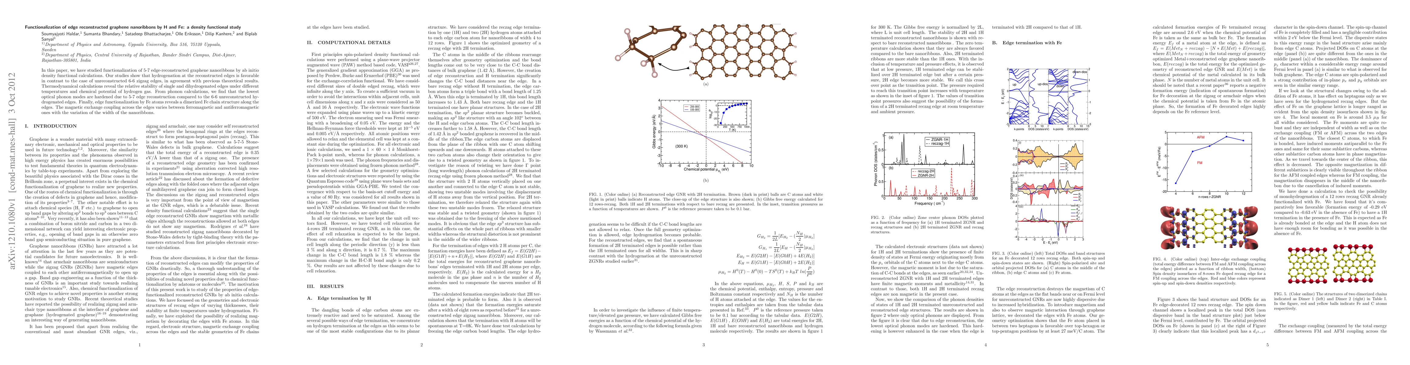 This paper investigates the functionalization of edge-reconstructed graphene nanoribbons using H and Fe atoms via density functional calculations. Hydrogenation at reconstructed edges is found to be more favorable than at unreconstructed edges, and Fe atoms form a dimerized chain along the edges, exhibiting variable magnetic exchange coupling.
