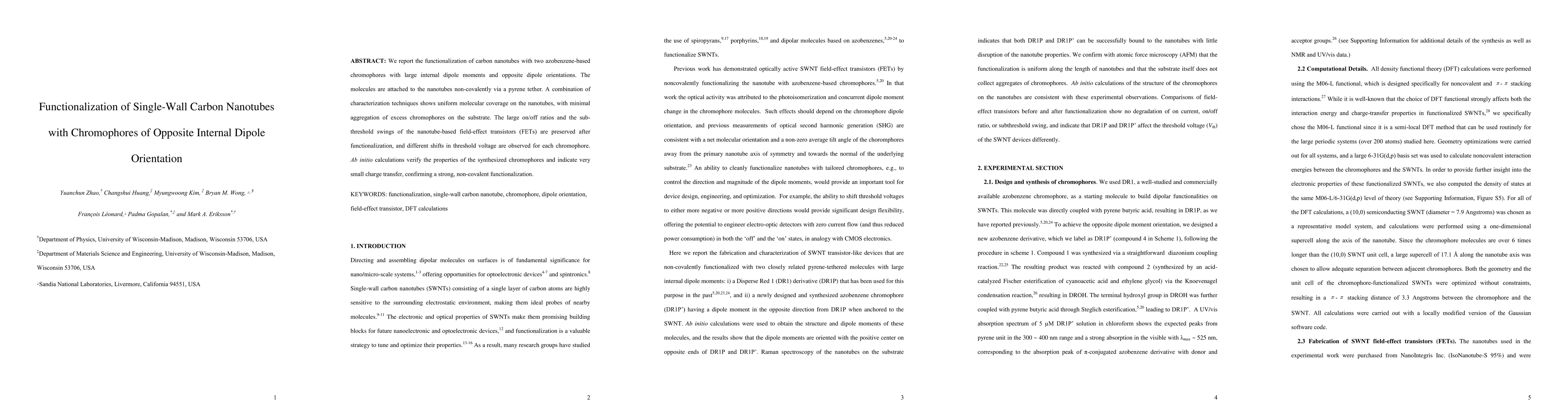 This paper details the non-covalent functionalization of single-wall carbon nanotubes with azobenzene-based chromophores having opposite dipole orientations, using a pyrene tether. The functionalization maintains the nanotube's electronic properties, evidenced by the preserved on/off ratios and sub-threshold swings in field-effect transistors, with ab initio calculations confirming minimal charge transfer.