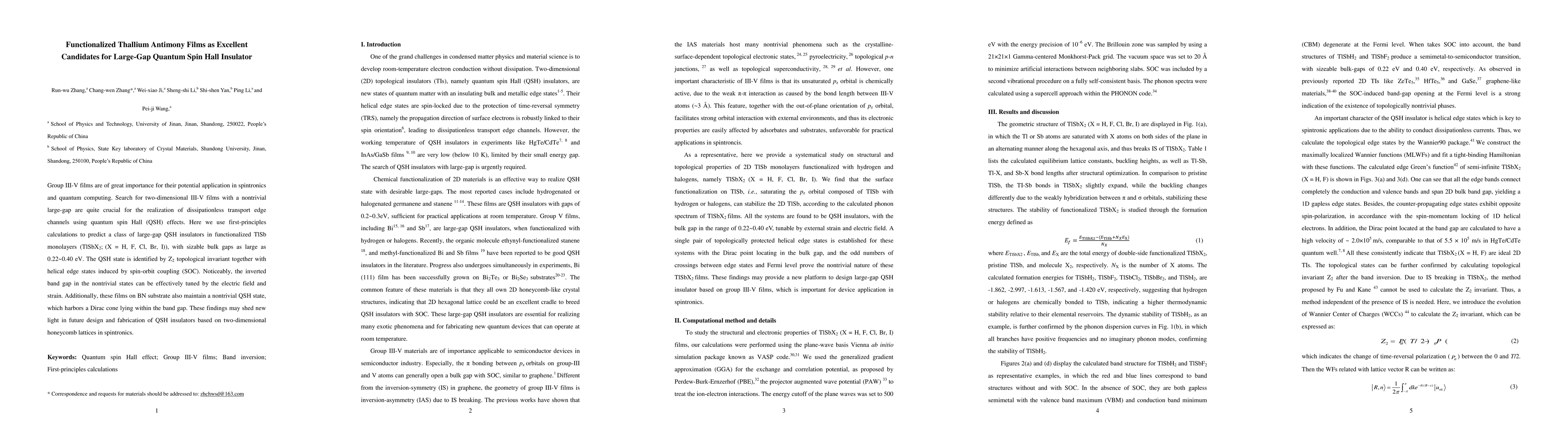 This paper predicts that functionalized thallium antimony (TlSbX2) monolayers are promising large-gap quantum spin Hall insulators, characterized by a nontrivial Z2 topological invariant and tunable band gaps via electric fields and strain, potentially advancing spintronics and quantum computing.