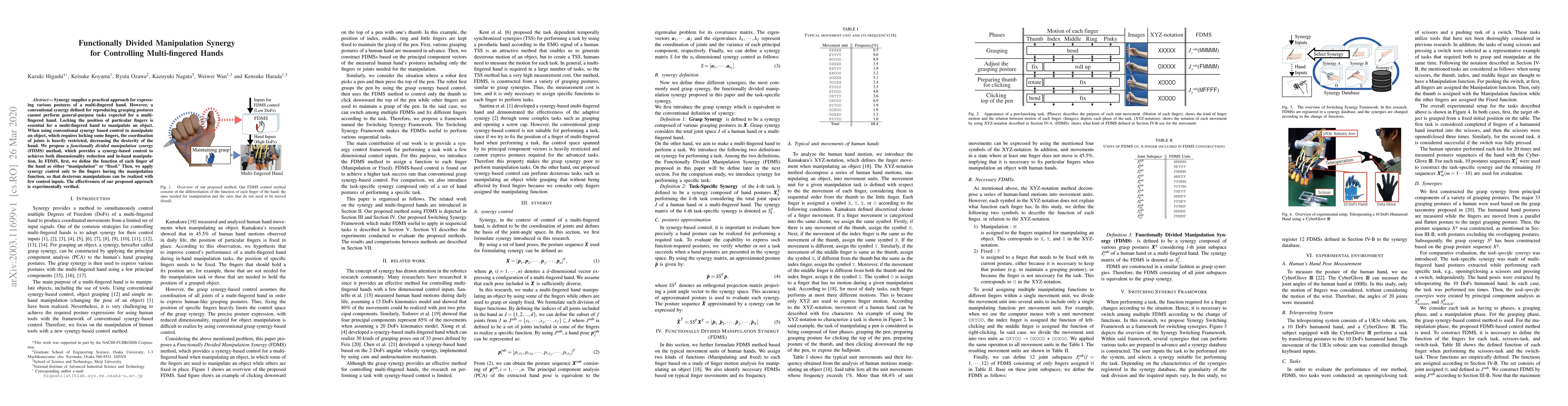 The paper proposes a functionally divided manipulation synergy (FDMS) method to enhance dexterity in multi-fingered hand control by allowing selective synergy application to fingers with manipulation functions while fixing others, thus enabling complex in-hand manipulations with fewer control inputs. Experimental results validate the effectiveness of this approach.