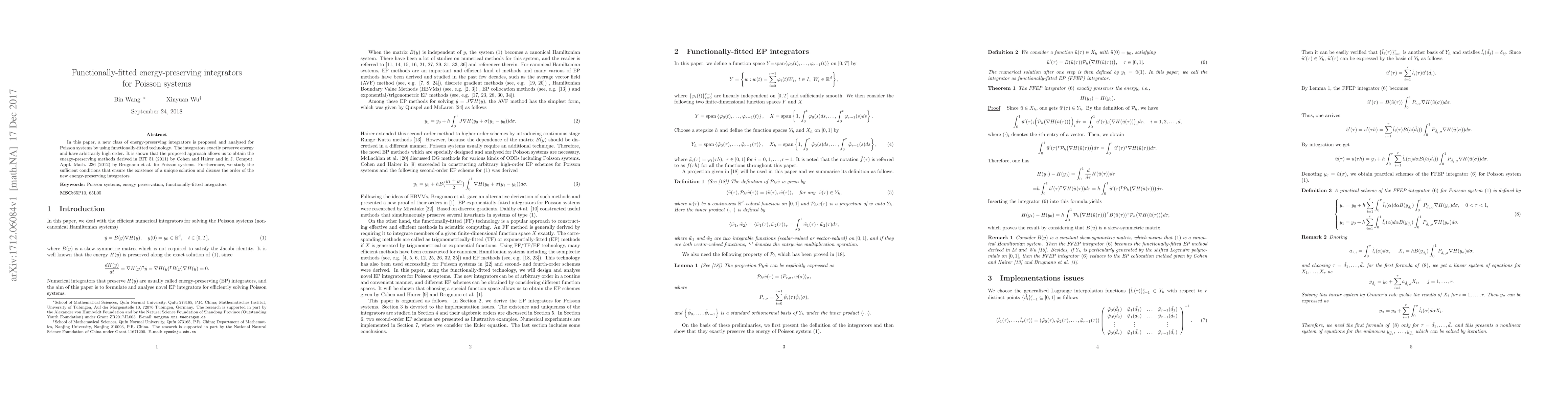 This paper introduces a new class of functionally-fitted energy-preserving integrators for Poisson systems, which exactly preserve energy and can achieve arbitrarily high order. The authors also provide conditions for unique solution existence and discuss the order of the developed integrators.