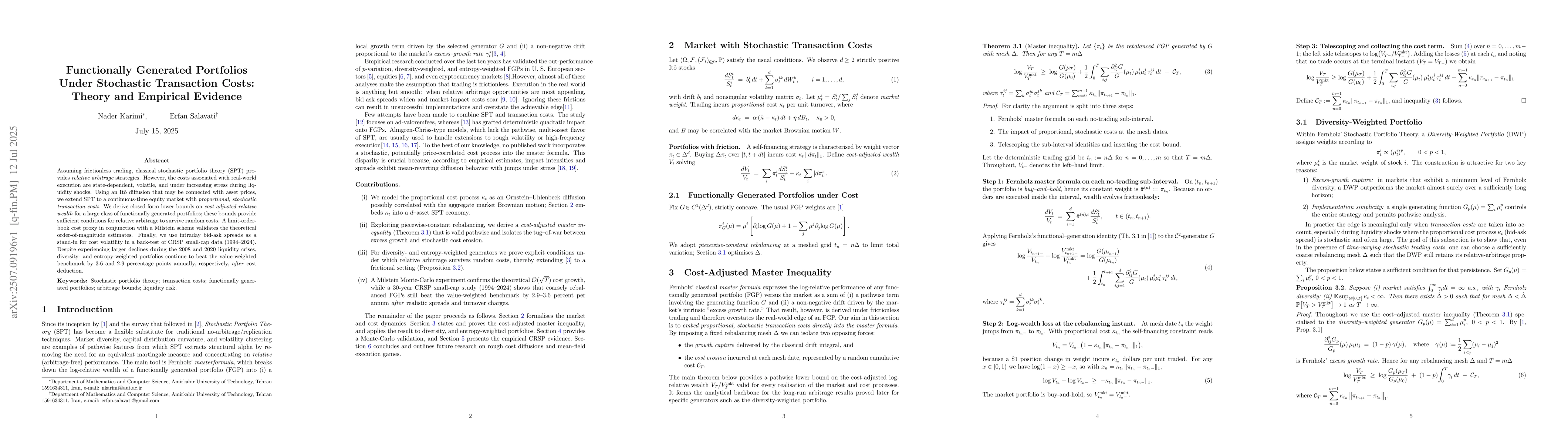 Assuming frictionless trading, classical stochastic portfolio theory (SPT) provides relative arbitrage strategies. However, the costs associated with real-world execution are state-dependent, volatile, and under increasing stress during liquidity shocks. Using an Ito diffusion that may be connected with asset prices, we extend SPT to a continuous-time equity market with proportional, stochastic transaction costs. We derive closed-form lower bounds on cost-adjusted relative wealth for a large class of functionally generated portfolios; these bounds provide sufficient conditions for relative arbitrage to survive random costs. A limit-order-book cost proxy in conjunction with a Milstein scheme validates the theoretical order-of-magnitude estimates. Finally, we use intraday bid-ask spreads as a stand-in for cost volatility in a back-test of CRSP small-cap data (1994--2024). Despite experiencing larger declines during the 2008 and 2020 liquidity crises, diversity- and entropy-weighted portfolios continue to beat the value-weighted benchmark by 3.6 and 2.9 percentage points annually, respectively, after cost deduction.
