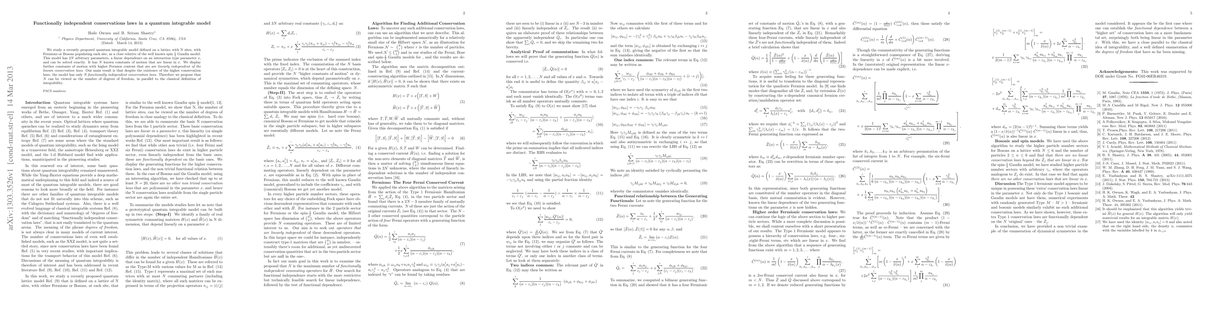 We study a recently proposed quantum integrable model defined on a lattice with N sites, with Fermions or Bosons populating each site, as a close relative of the well known spin-1/2 Gaudin model. This model has 2N arbitrary parameters, a linear dependence on an interaction type parameter x, and can be solved exactly. It has N known constants of motion that are linear in x. We display further constants of motion with higher Fermion content, that are are linearly independent of the known conservation laws. Our main result is that despite the existence of these higher conservation laws, the model has only N functionally independent conservation laws. Therefore we propose that N can be viewed as the number of degrees of freedom, in parallel to the classical definition of integrability.