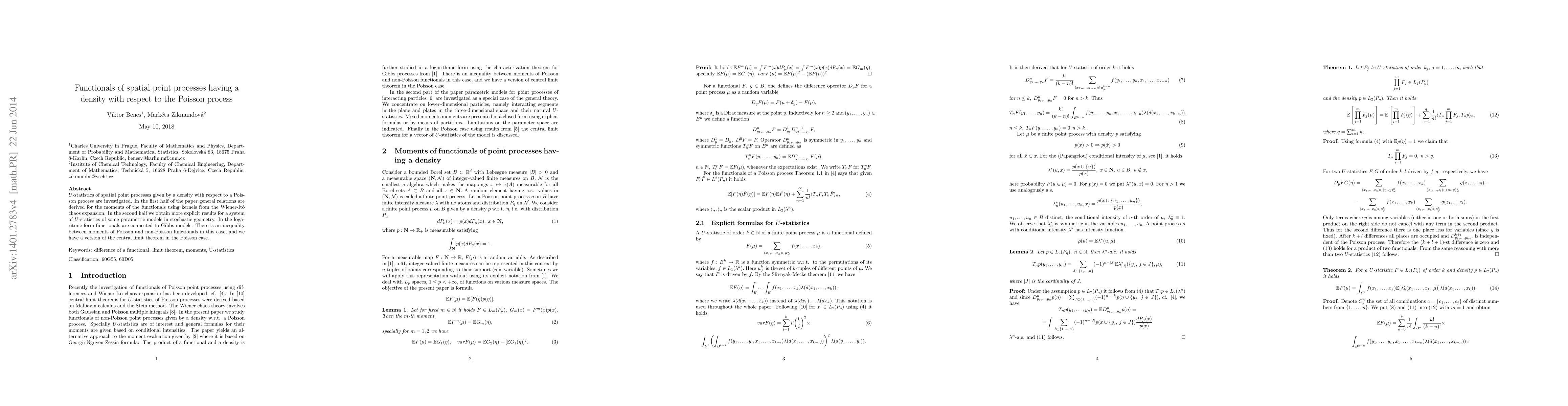 This paper investigates U-statistics of spatial point processes relative to a Poisson process, deriving general moment relations using Wiener-Ito chaos expansion. It then provides explicit results for specific parametric models in stochastic geometry, establishing a connection between logarithmic functionals and Gibbs models, and proving an inequality and a central limit theorem for Poisson cases.