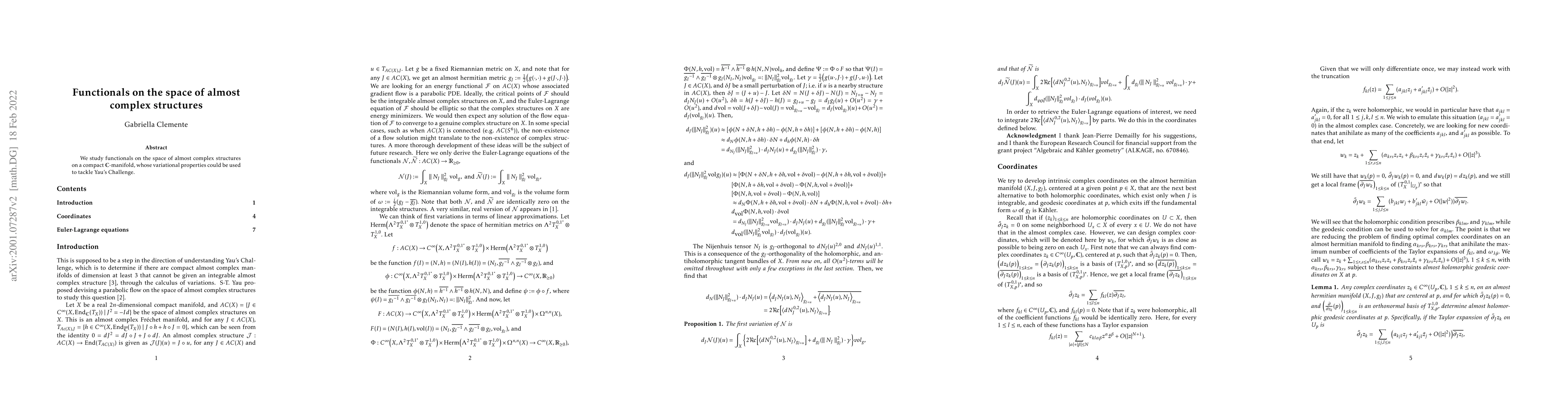 We study functionals on the space of almost complex structures on a compact $\mathbb{C}$-manifold, whose variational properties could be used to tackle Yau's Challenge.