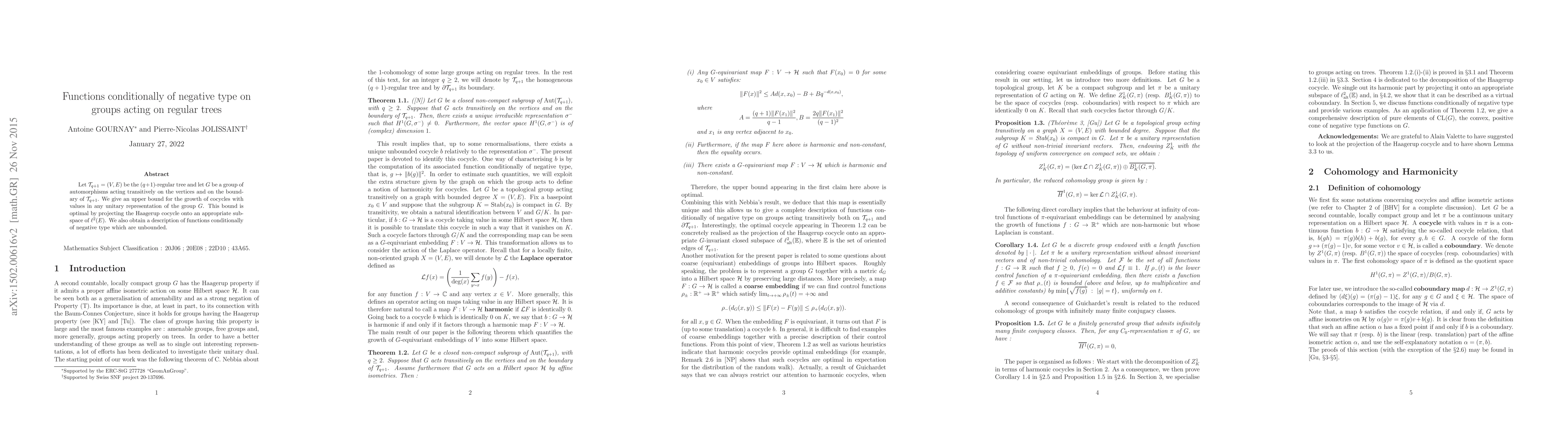 This paper establishes an upper bound for the growth of cocycles in unitary representations of groups acting on regular trees, with applications to functions conditionally of negative type.