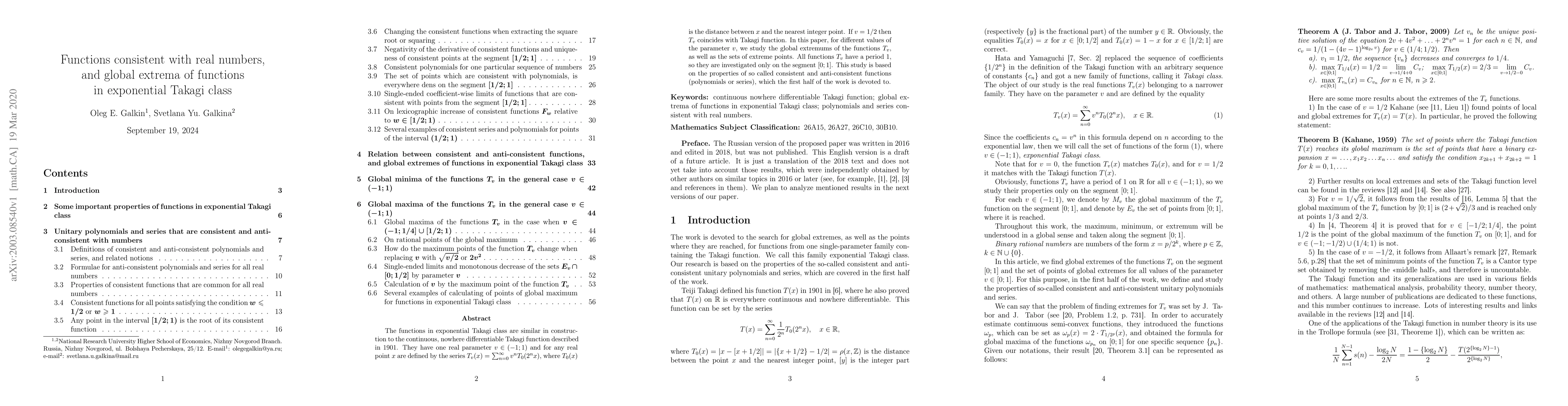 The functions of the Takagi exponential class are similar in construction to the continuous, nowhere differentiable Takagi function described in 1901. They have one real parameter $v\in (-1;1)$ and at points $x\in{\mathbb R}$ are defined by the series $T_v(x) = \sum_{n=0}^\infty v^n T_0(2^nx)$, where $T_0(x)$ is the distance between $x$ and the nearest integer point. If $v=1/2$ then $T_v$ coincides with Takagi's function. In this paper, for different values of the parameter $v$, we study the global extremes of the functions $T_v$, as well as the sets of extreme points. All functions of $T_v$ have a period of $1$, so they are investigated only on the segment $[0;1]$. This study is based on the properties of consistent and anti-consistent polynomials and series, which the first half of the work is devoted to.