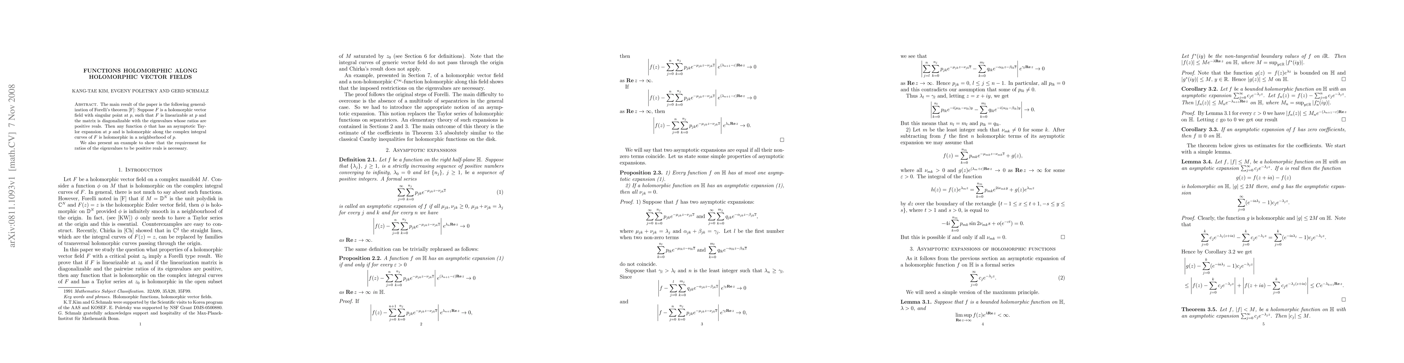 The main result of the paper is the following generalization of Forelli's theorem: Suppose F is a holomorphic vector field with singular point at p, such that F is linearizable at p and the matrix is diagonalizable with the eigenvalues whose ratios are positive reals. Then any function $\phi$ that has an asymptotic Taylor expansion at p and is holomorphic along the complex integral curves of F is holomorphic in a neighborhood of p. We also present an example to show that the requirement for ratios of the eigenvalues to be positive reals is necessary.