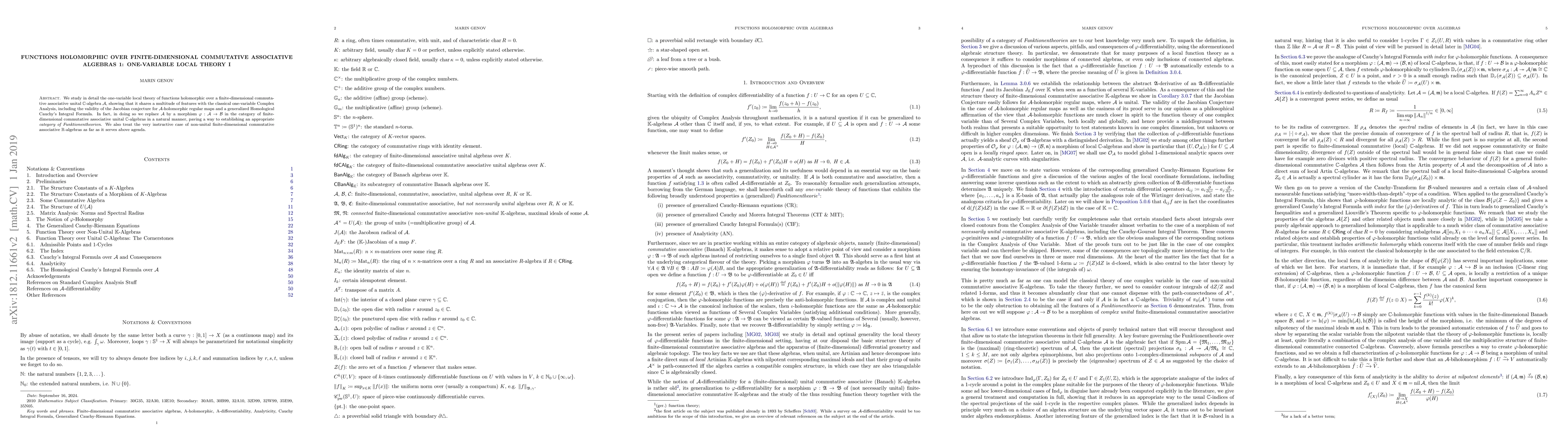 We study in detail the one-variable local theory of functions holomorphic over a finite-dimensional commutative associative unital $\mathbb{C}$-algebra $\mathcal{A}$, showing that it shares a multitude of features with the classical one-variable Complex Analysis, including the validity of the Jacobian conjecture for $\mathcal{A}$-holomorphic regular maps and a generalized Homological Cauchy's Integral Formula. In fact, in doing so we replace $\mathcal{A}$ by a morphism $\varphi: \mathcal{A} \to \mathcal{B}$ in the category of finite-dimensional commutative associative unital $\mathbb{C}$-algebras in a natural manner, paving a way to establishing an appropriate category of Funktionentheorien (ger. function theories). We also treat the very instructive case of non-unital finite-dimensional commutative associative $\mathbb{R}$-algebras as far as it serves above agenda.
